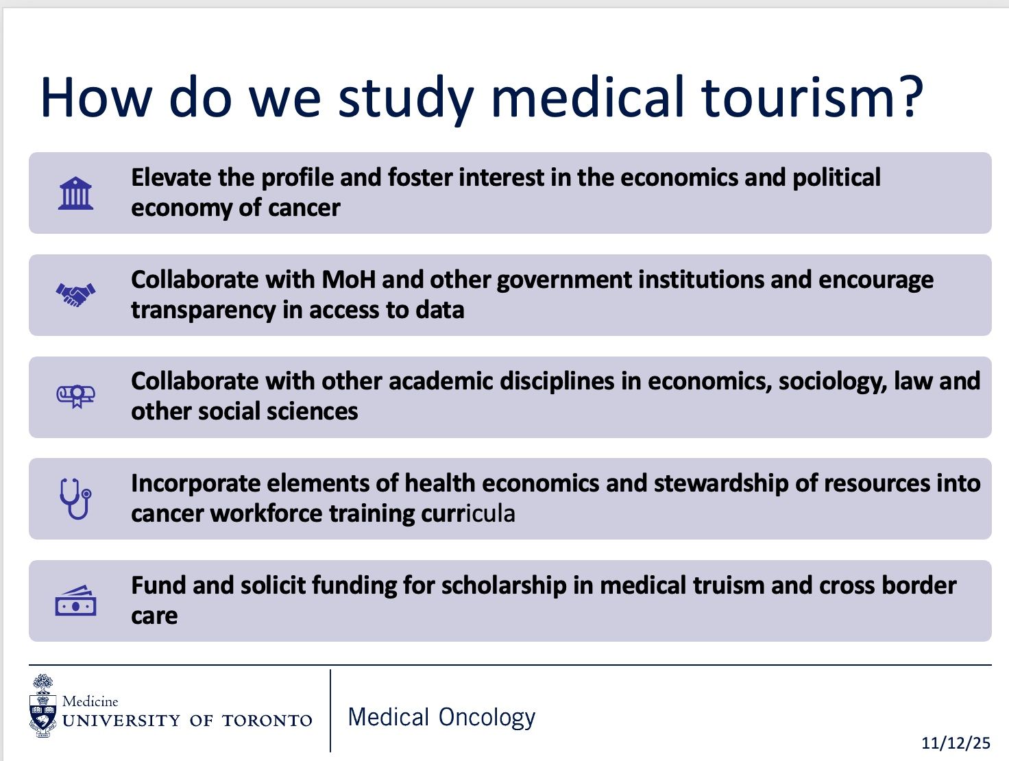 Research gaps identified include economic impact, trust in the system, financial toxicity, and the need to include fininacial toxicity from alternative medicine, which is emerging as a driver in medical tourism, pros and cons of being destination countries. We hope that the discussion and the research will continue.”