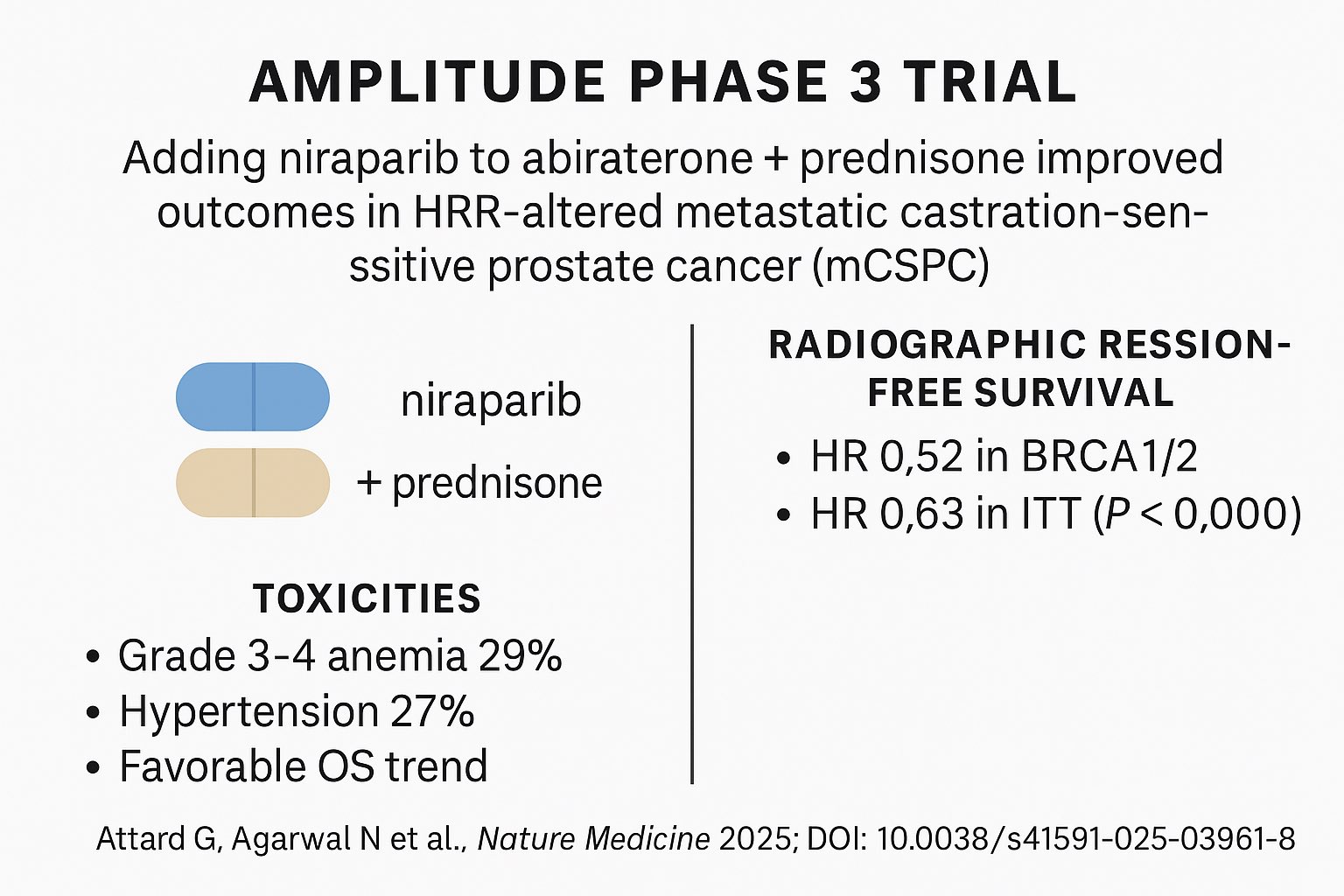 - Adding niraparib to abiraterone increased outcomes in HRR-altered mHSPC prostate cancer