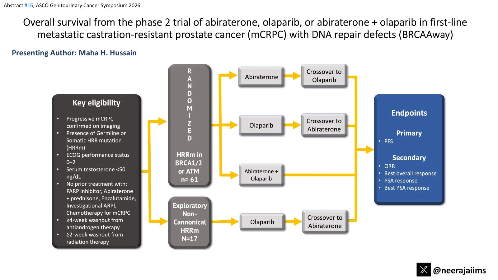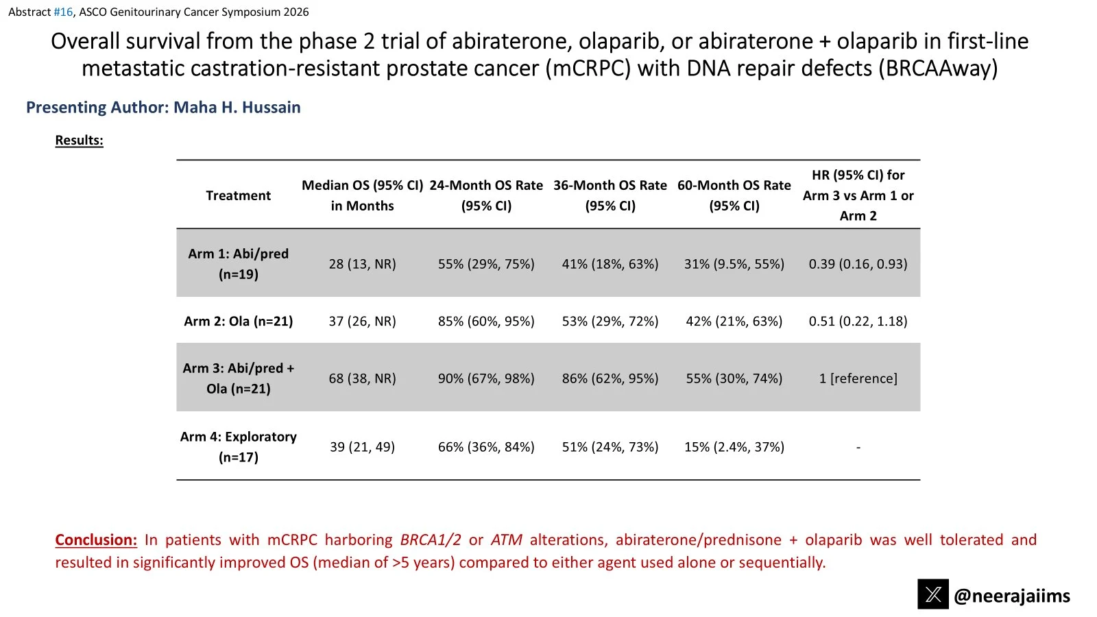 ASCO GU 2026 by Maha Hussain BRCAAway Ph2 trial in 1L mCRPC w/ BRCA1/2 or ATM alterations prostate cancer improved OS (68 mo) w/ abi + olaparib vs each monotherapy or sequential use supports upfront PARPi+ARPI.