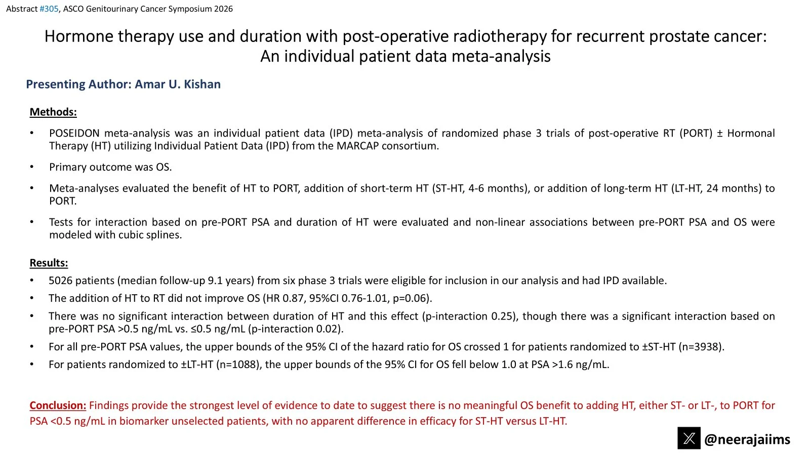ASCO GU 2026 by Amar Kishan POSEIDON IPD meta-analysis of post-op RT ± ADT in recurrent prostate cancer No OS benefit from adding ADT to RT (HR 0.87, p=0.06) at PSA <0.5 ng/mL.