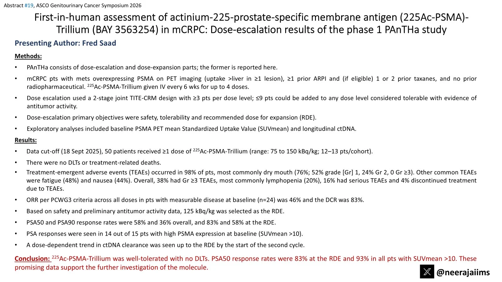 ASCO GU 2026 by Fred Saad. Ph1 trial of 225Ac-PSMA-Trillium in mCRPC prostate cancer No DLTs promising PSA50 83% at 125 kBq/kg (RDE), ORR 46%, response in PSMA PET SUVmean>10.