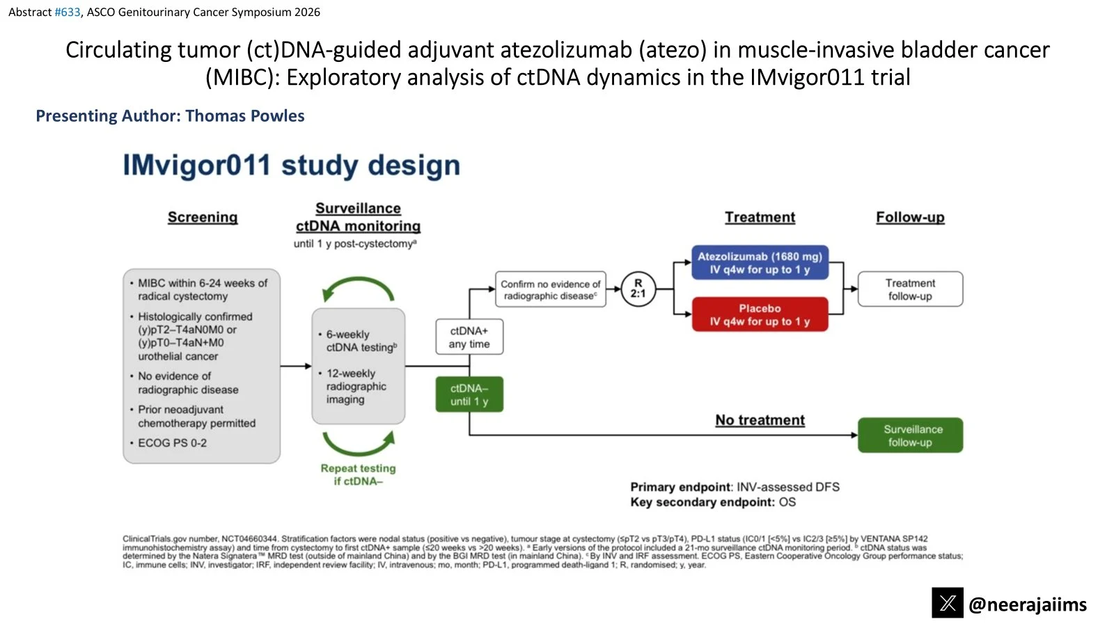 ASCO GU 2026 by Tom Powles. IMvigor011 ctDNA dynamics in MIBC bladder cancer early ctDNA + linked to worse DFS Atezo ctDNA vs placebo (P=0.009) ctDNA clearance associated with improved DFS and OS.