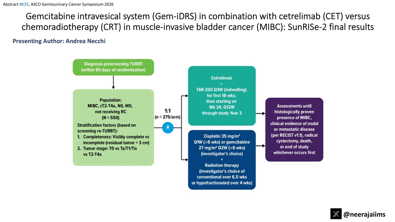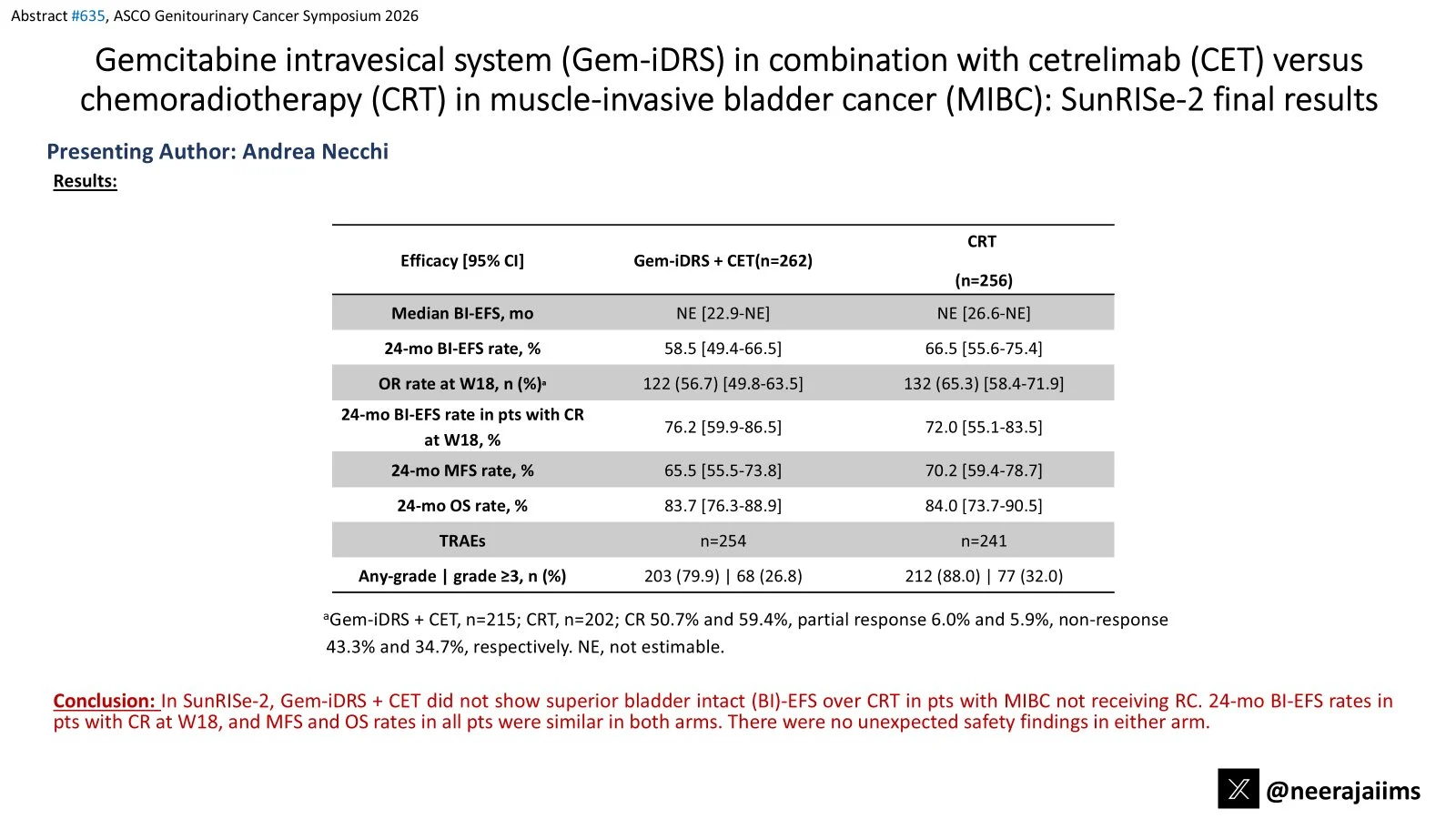 ASCO GU 2026 by Andrea Necchi. SunRISe-2 in MIBC bladder cancer pts ineligible/declining surgery Gem-iDRS+CET did not improve bladder-intact EFS vs chemoRT (HR 1.71) MFS/OS similar great efforts.