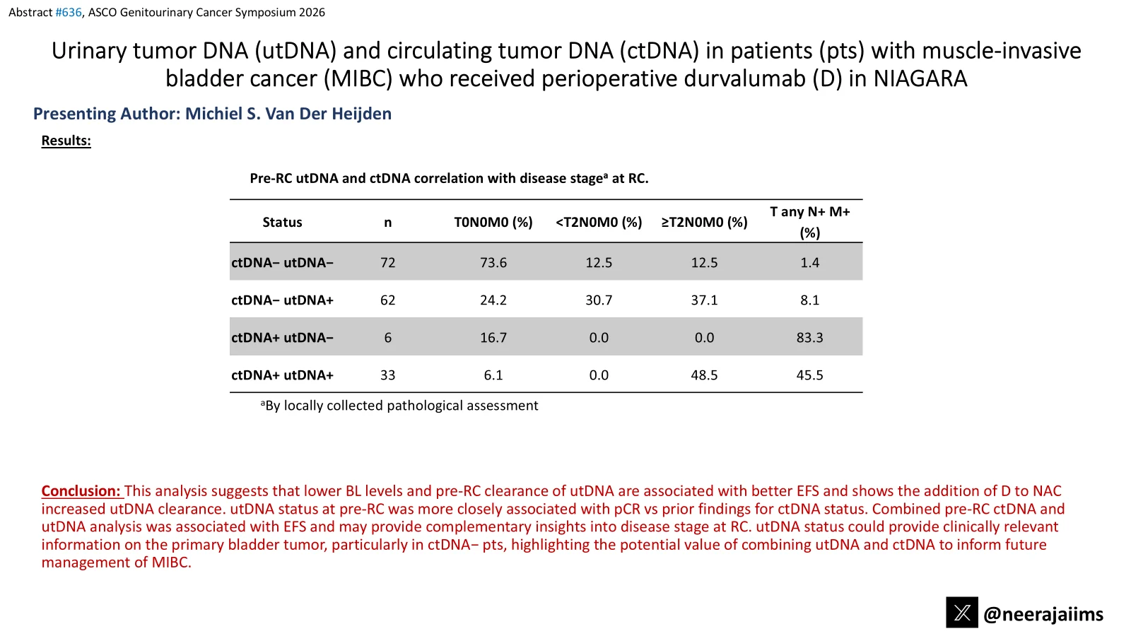 ASCO GU 2026 by Michiel van der Heijden. NIAGARA trial bladder cancer Periop durvalumab+NAC urine utDNA clearance (39% vs 27%) utDNA clearance pCR (72% vs 18%), dual utDNA/ctDNA- showed 90% 24-mo EFS.