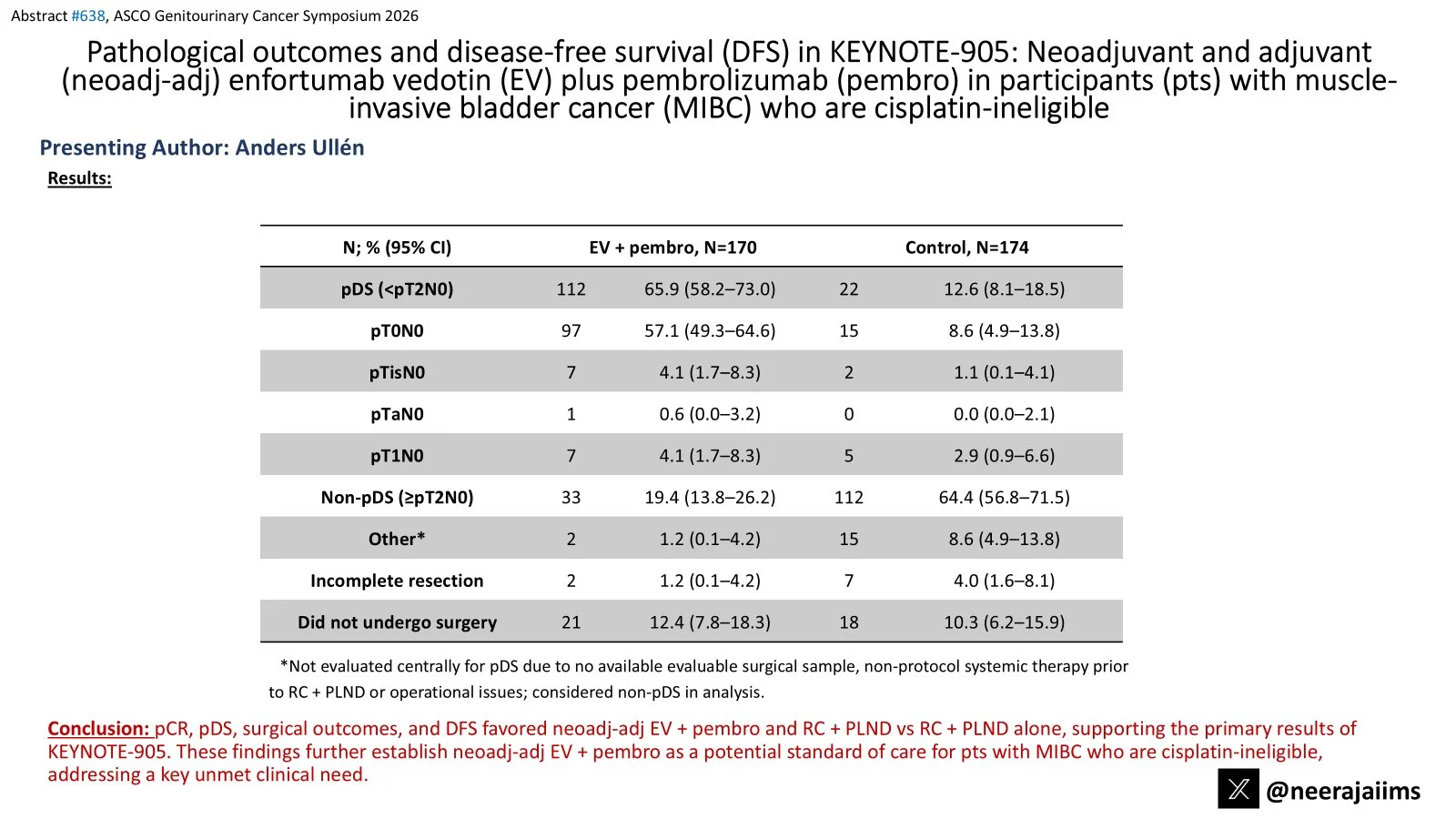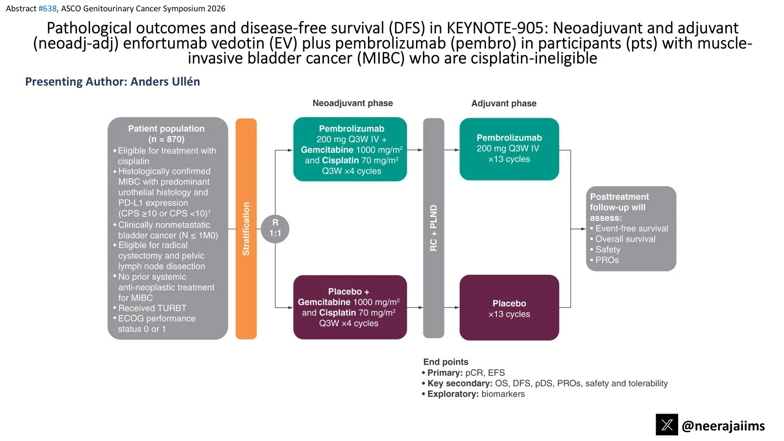 ASCO GU 2026 by Anders Ullen. KEYNOTE-905 in cisplatin ineligible MIBC bladder cancer Periop EV+pembro + RC/PLND OS, pCR, pDS, surgical outcomes and DFS vs surgery alone Supports EV+pembro as new SOC.