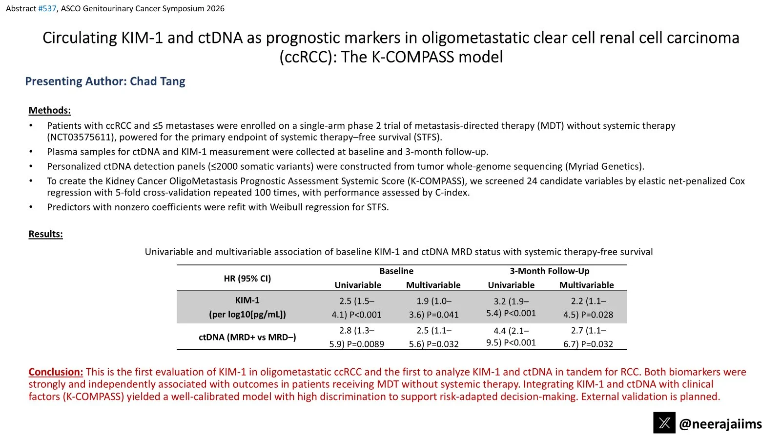 ASCO GU 2026 by Chad Tang. Oligomet RCC kidney cancer treated w/ MDT KIM-1 and ctDNA independently predicted recurrence and survival Combined w/ clinical factors (K-COMPASS) risk stratification.
