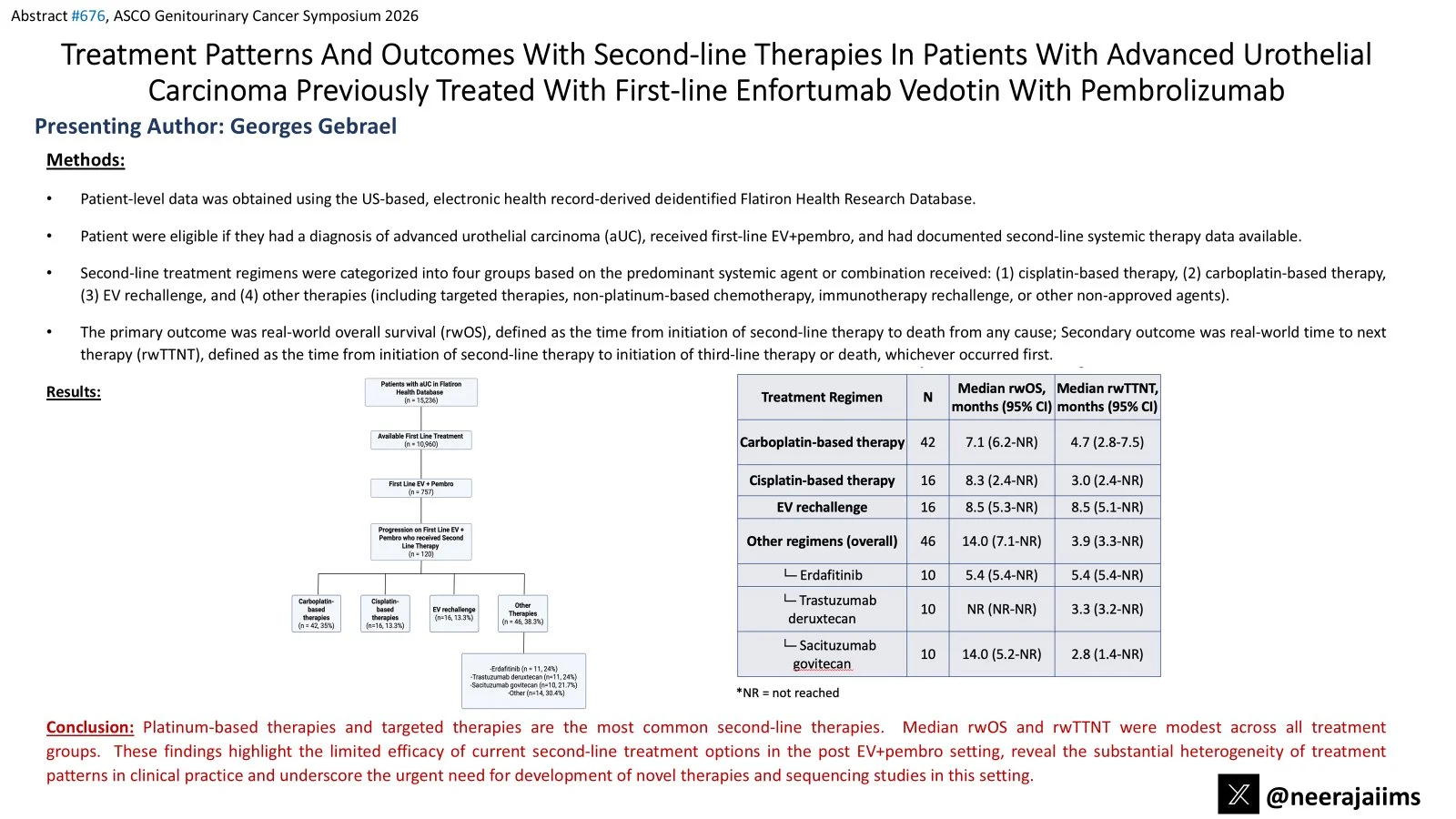 ASCO GU 2026 by Georges Gebrael. In real-world US advanced bladder cancer pts Platinum-based and targeted Rx are most common 2L Post-EV+Pembro outcomes are modest.
