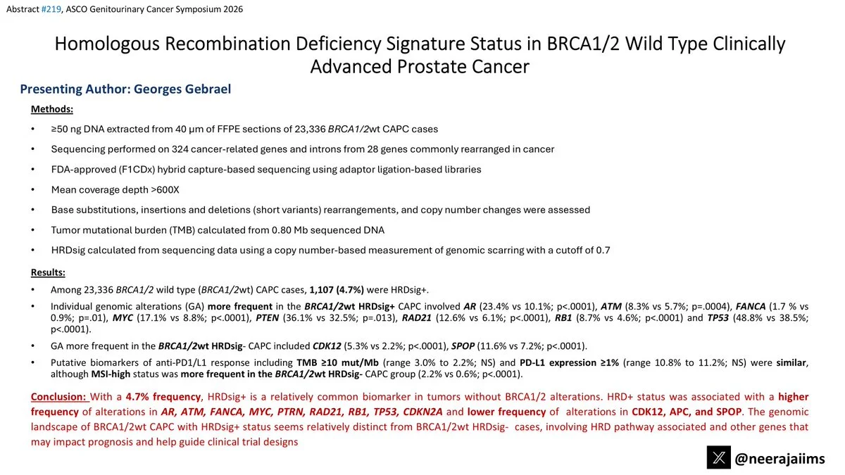 ASCO GU 2026 by Georges Gebrael. Distinct genomic landscape of BRCA1/2 wild type HRDsig+ prostate cancer (n=23,336 pts Foundation Medicine) compared to HRDsig– prostate cancer may impact development of combination Rx.