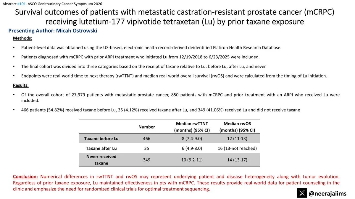 ASCO GU 2026 by Micah Ostrowski. Real-world study of 850 pts w/ Lu-177 treated mCRPC prostate cancer in Flatiron Health. Lu-177 remained effective regardless of prior taxane exposure.