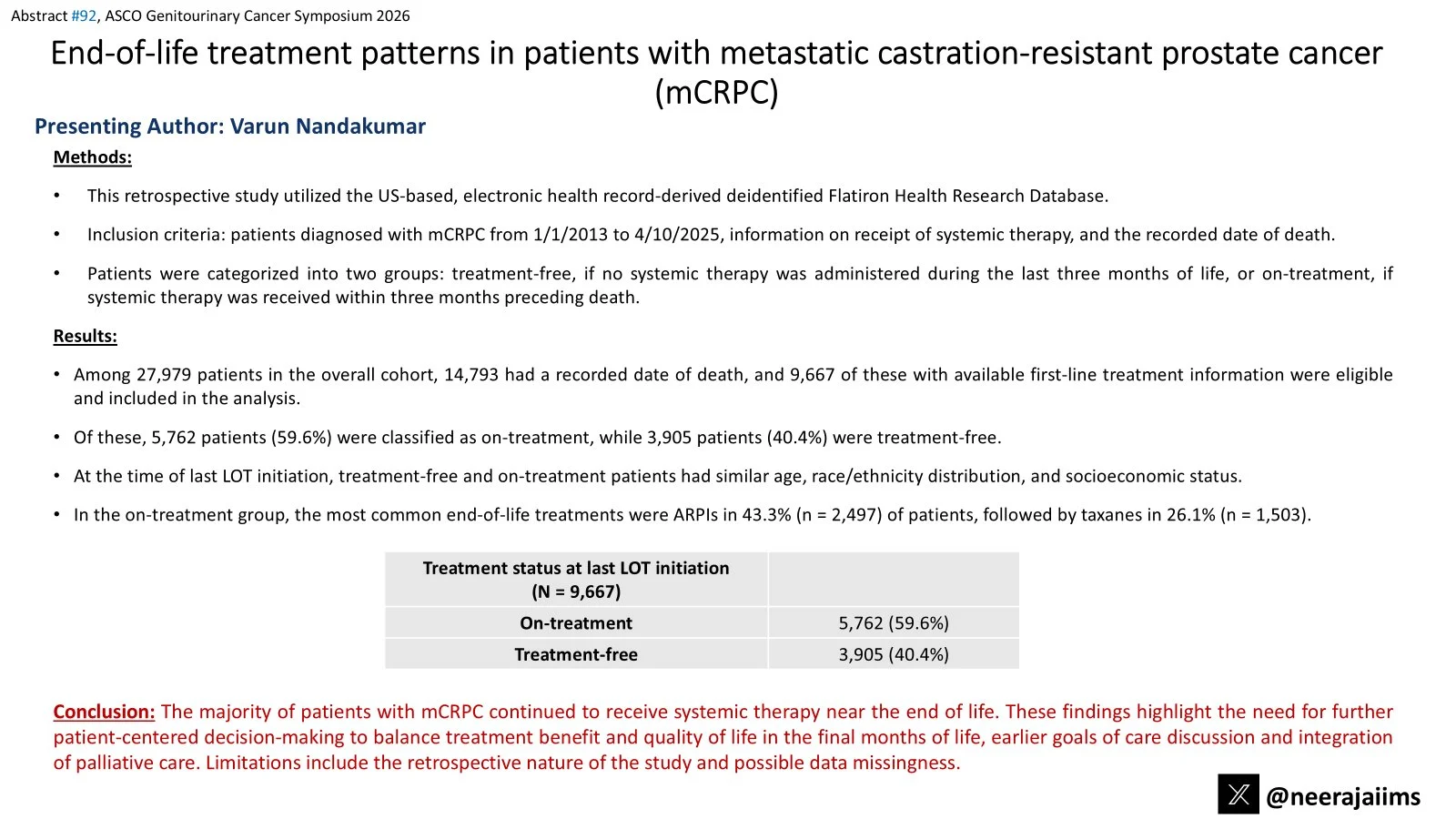 ASCO GU 2026 by Varun Nandakumar. End-of-life (EOL) Rx analysis of ~10,000 pts w/ mCRPC prostate cancer in Flatiron Health ~60% remained on Rx in last 3 mo of life need for more patient-centered EOL care.
