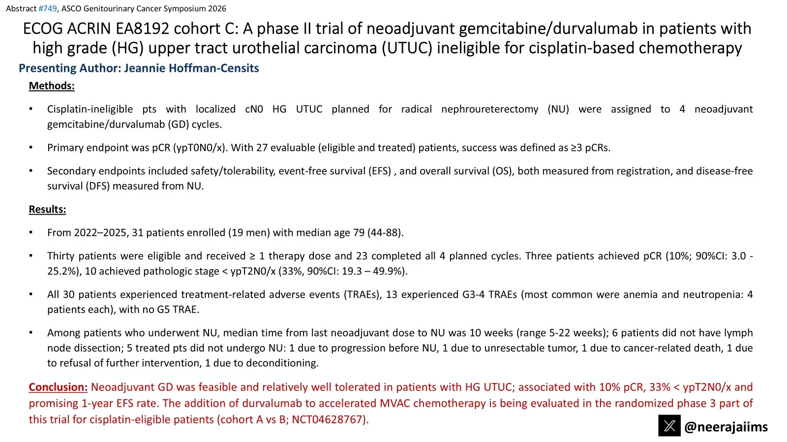 ASCO GU 2026 by Jean Hoffman-Censits, Petros Grivas, ECOG-ACRIN Cancer Research Group. Neoad Gem-Durva in cisplatin-unfit pts w/high grade UTUC bladder cancer pCR 10%, <ypT2N0/X 33%, promising 1-year EFS rate, manageable tox Ph3 ongoing in cisplatin-fit pts.