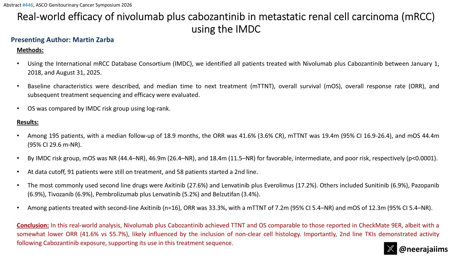 ASCO GU 2026 by Martín Zarbá. Real-world outcomes w/1L Cabo+Nivo in mRCC kidney cancer ORR 41.6%, TTNT 19.4mo, OS 44.4mo, comparable to CM-9ER 2L TKIs active post-cabo, supporting this sequencing.