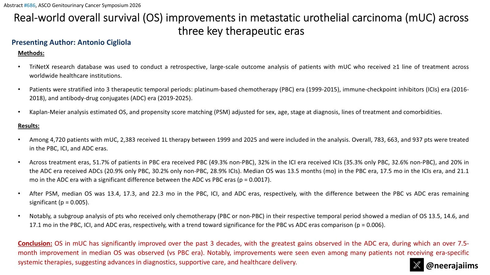 ASCO GU 2026 Congrats Antonio Cigliola. Analysis of 2,383 pts w/mUC across 3 Rx eras bladder cancer OS improved from 13.5 mo(platinum-based Rx)-17.5 mo(ICI)-21.1 mo(ADC) greatest gains in the ADC era.