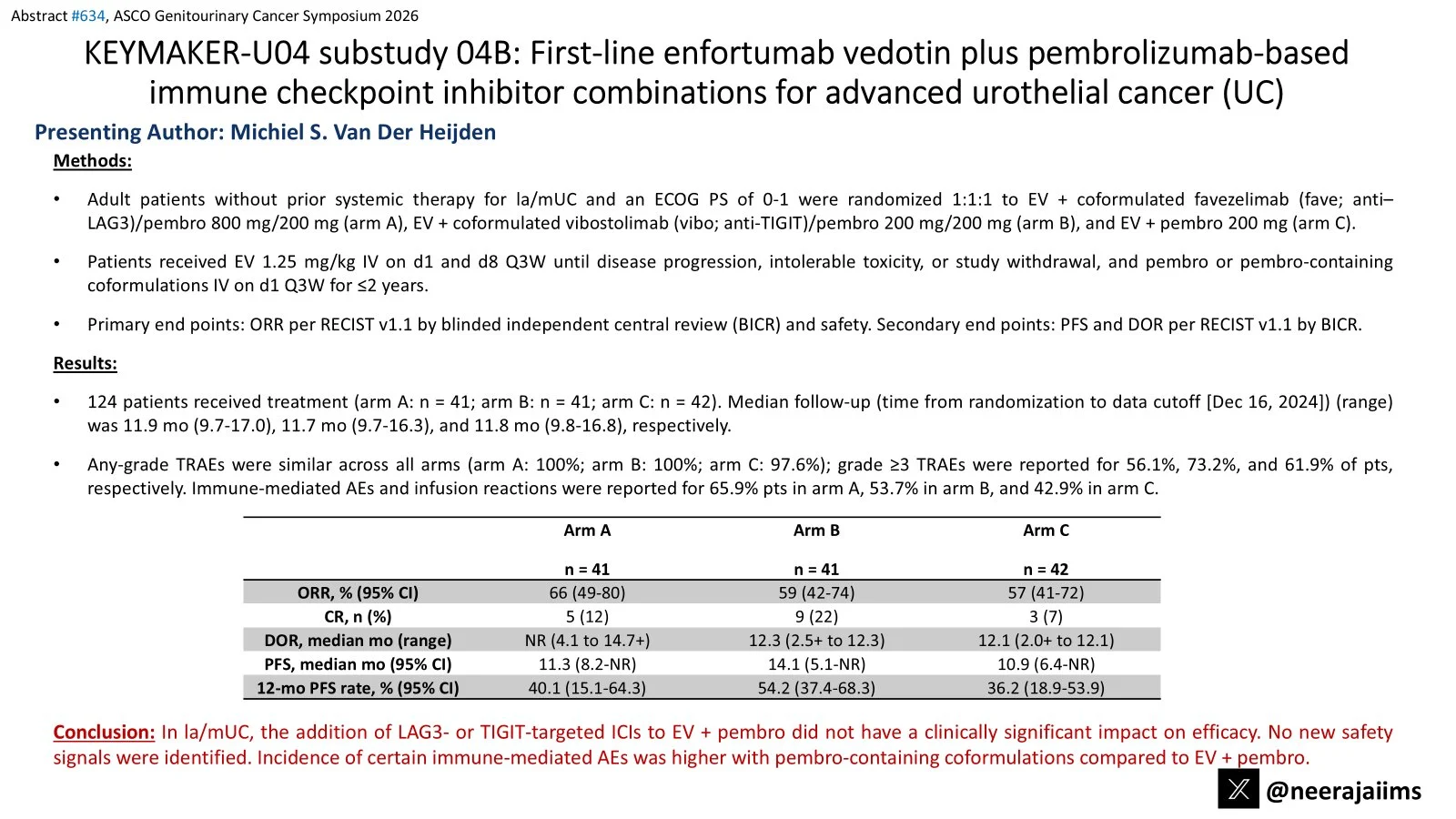 ASCO GU 2026 by Michiel van der Heijden, addition of anti-LAG3 or anti-TIGIT ICIs to EV+pembro in mUC did not improve efficacy of EV+P bladder cancer higher irAEs w/coformulations.