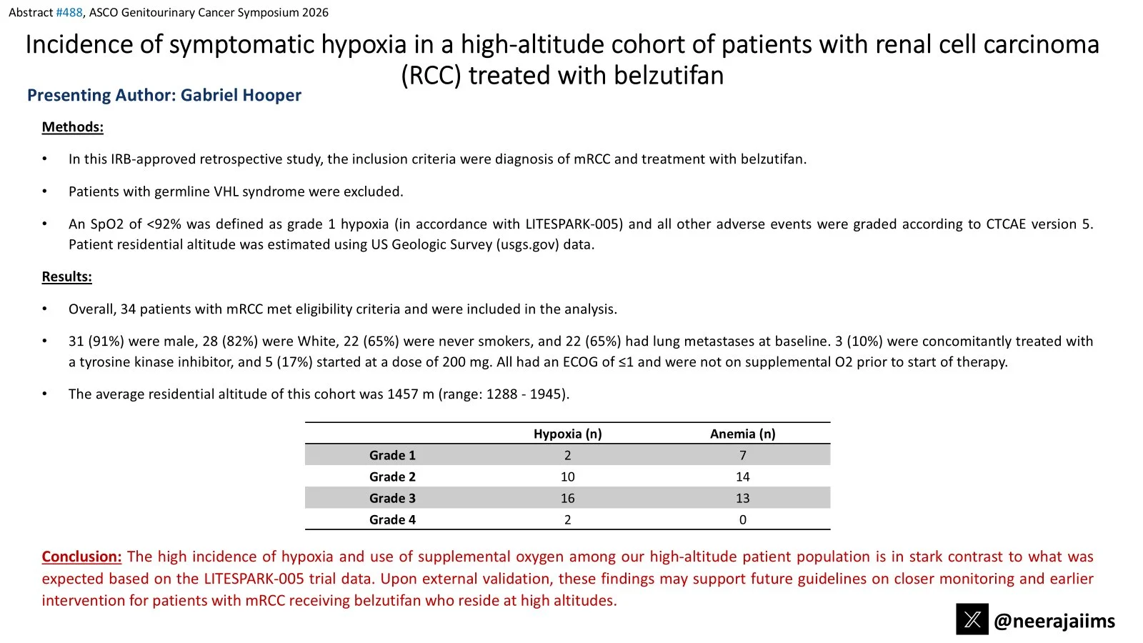 ASCO GU 2026 by Gabriel Hooper, pts w/ mRCC kidney cancer on belzutifan 53% had gr≥3 hypoxia, 80% gr≥2 anemia data suggest close monitoring of pts on belzutifan living/visiting high altitude areas.