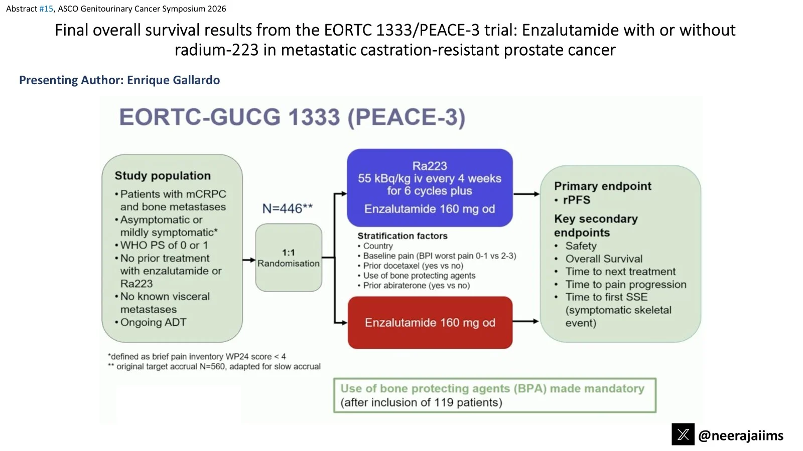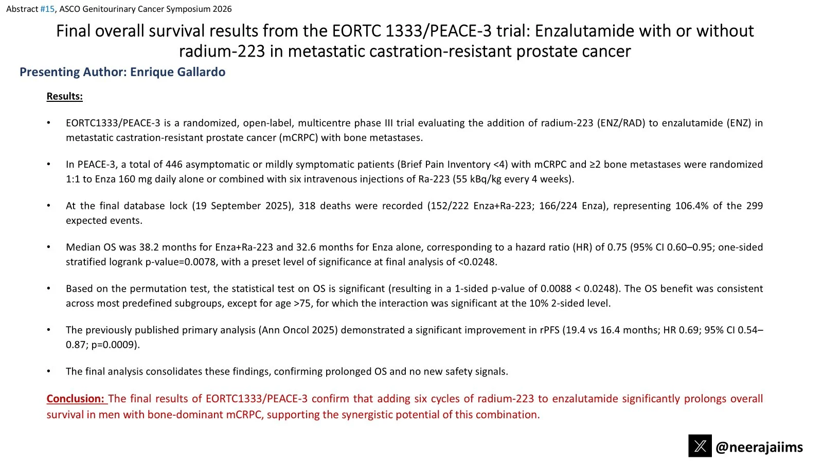ASCO GU 2026 by Enrique Gallardo. Final OS from PEACE-3 in mCRPC prostate cancer Enza + Ra-223 vs Enza showed OS benefit (consistent across subgroups), no new safety signals.