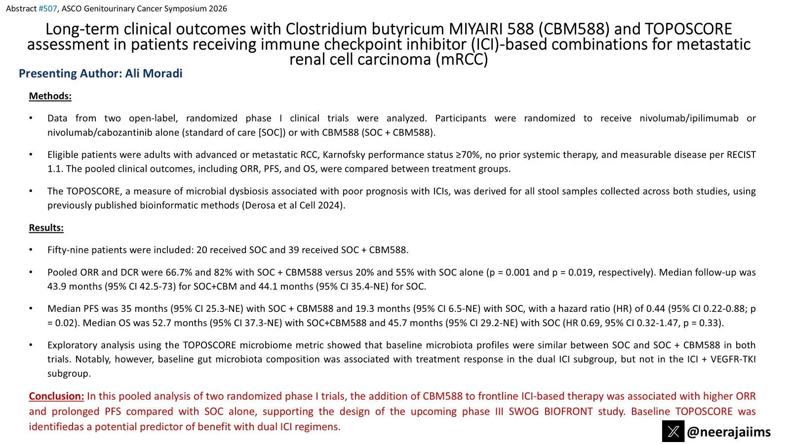 ASCO GU 2026 by Ali Moradi. Long-term outcomes w/ live bacteria (CBM588) in mRCC kidney cancer addition of CBM588 to frontline ICI Rx ORR and PFS supporting upcoming Ph3 SWOG. BIOFRONT study.