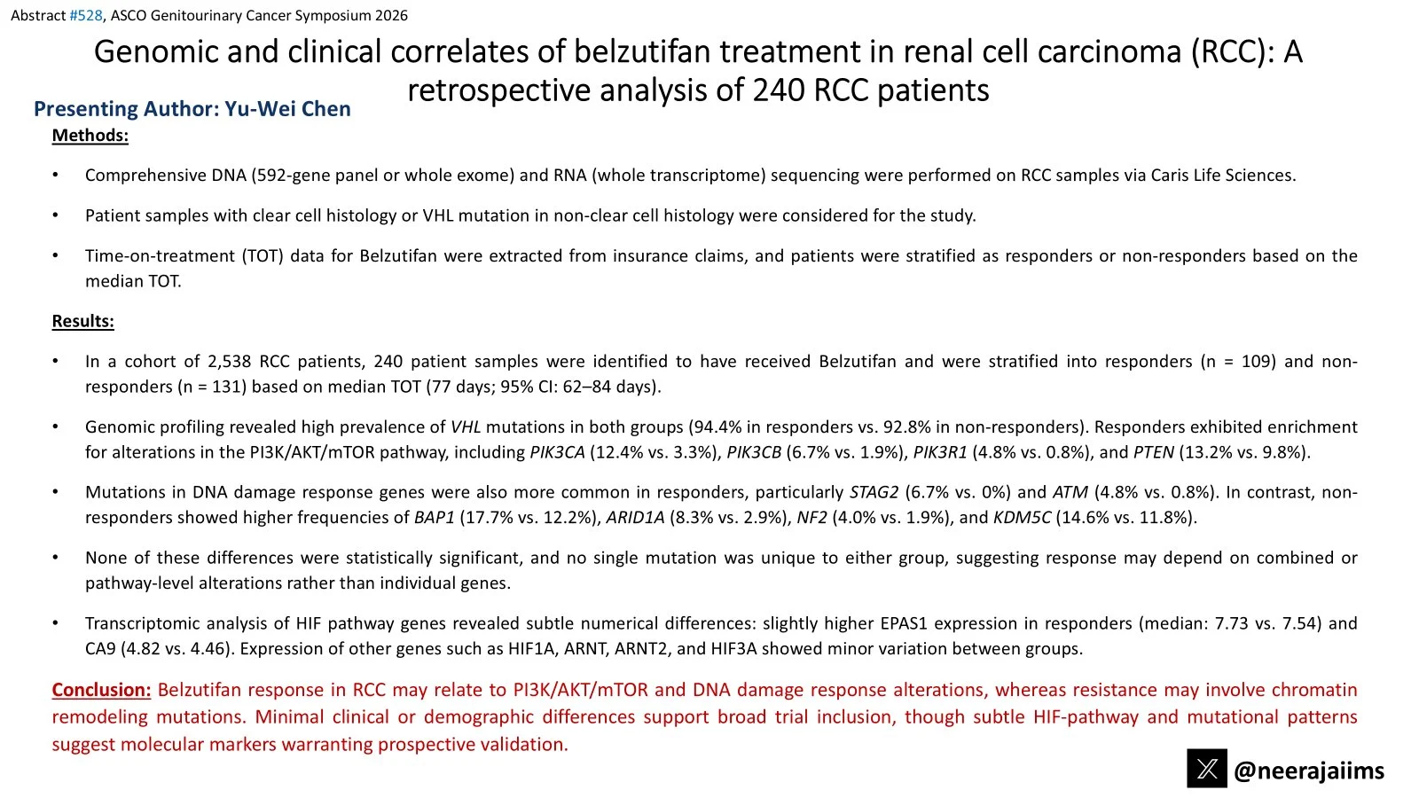ASCO GU 2026 by Yu-Wei Chen. PI3K/AKT/mTOR and DDR alterations were associated w/ response to belzutifan in RCC kidney cancer prospective validation needed.