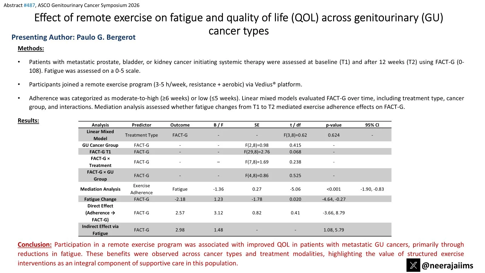 ASCO GU 2026 Congrats Paulo G Bergerot and team participation in remote exercise program was associated w/ QOL (decreased fatigue) in pts w/ metastatic GU cancers.