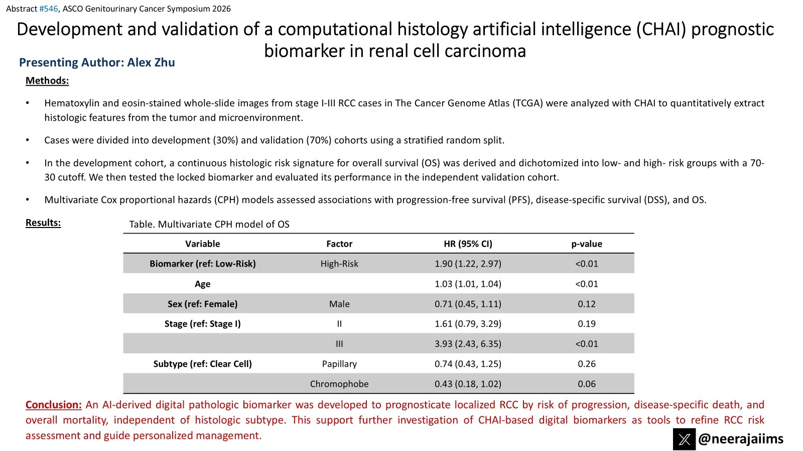 ASCO GU 2026 by Alex Zhu. AI-derived digital pathology biomarker (CHAI) independently prognostic for progression and OS in localized RCC kidney cancer further validation needed.