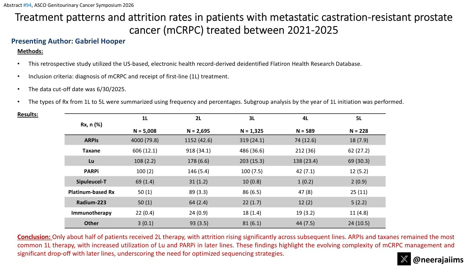 ASCO GU 2026 by Gabriel Hooper. Rx patterns of ~5000 pts w/ mCRPC prostate cancer in Flatiron Health. ARPIs and taxanes remained most common 1L Rx only ~50% received 2L Rx suggesting need to optimize sequencing.