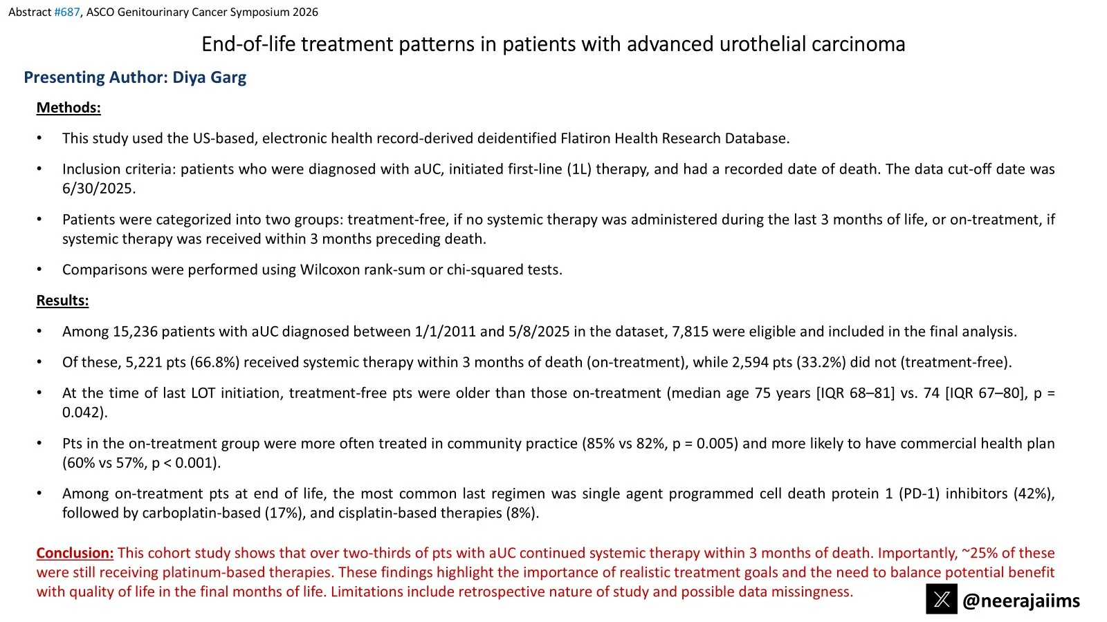ASCO GU 2026 Congrats Diya Garg, GU Cancer Research Program. Merit Award Conquer Cancer. End-of-life Rx data in 7,815 pts w/aUC bladder cancer 67% remained on Rx 3 mo before death pts need better EOL care.