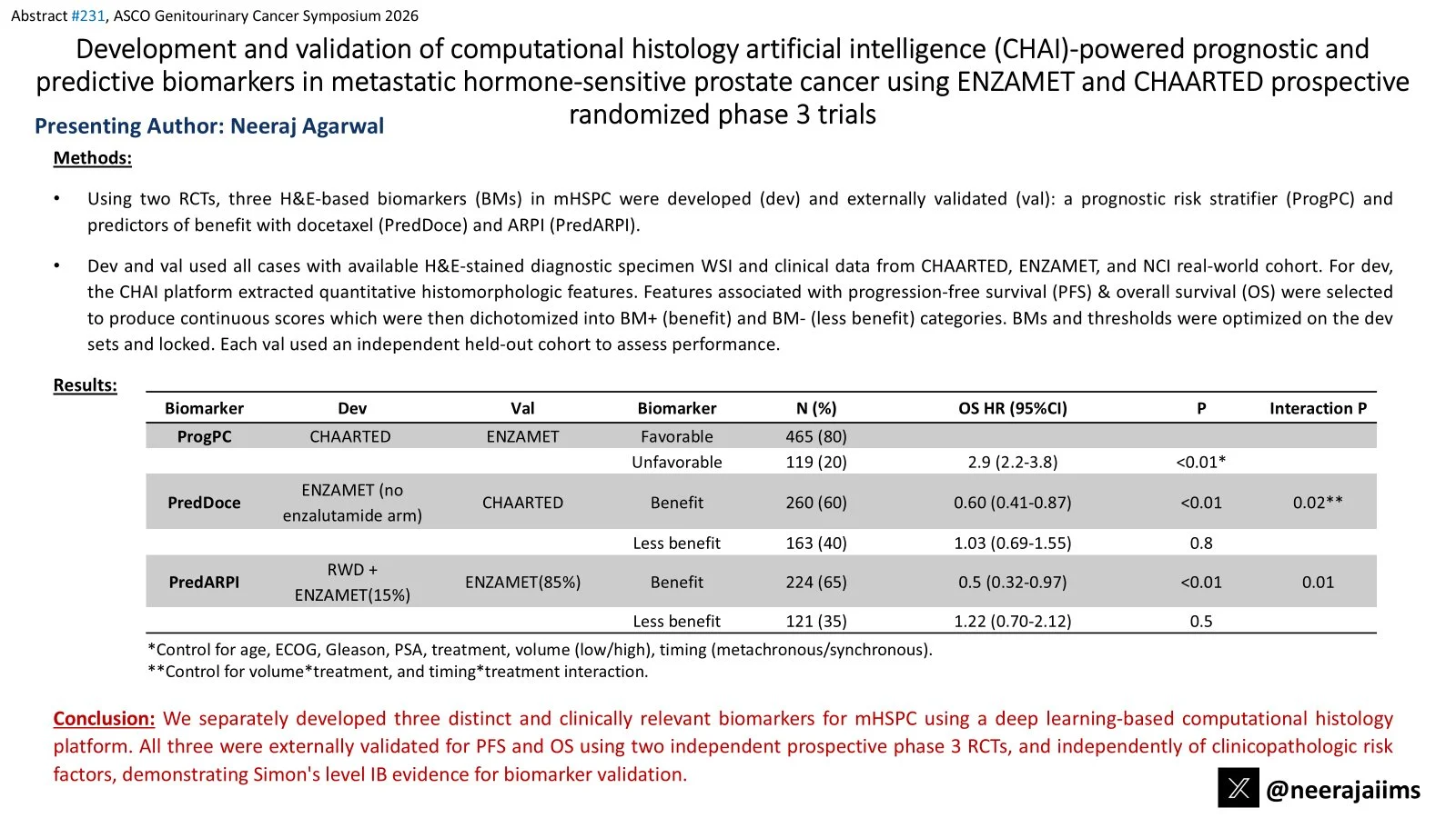 ASCO GU 2026. AI-powered digital histology (CHAI) biomarker (BM) in mHSPC prostate cancer using CHAARTED and ENZAMET BM+ status prognostic for PFS/OS and predicts benefit w/adding docetaxel or ARPI.
