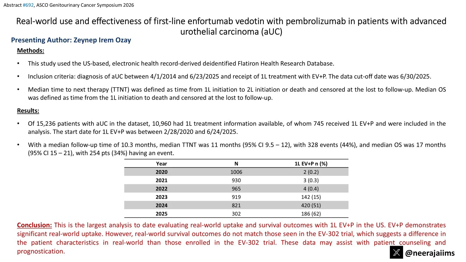 ASCO GU 2026 by Zeynep Irem Ozay. Real-world analysis of 745 pts w/ aUC bladder cancer treated w/EV+Pembro Median OS 17 mo (low compared to ph3 trial) Data suggest need for improved management in RW pts.