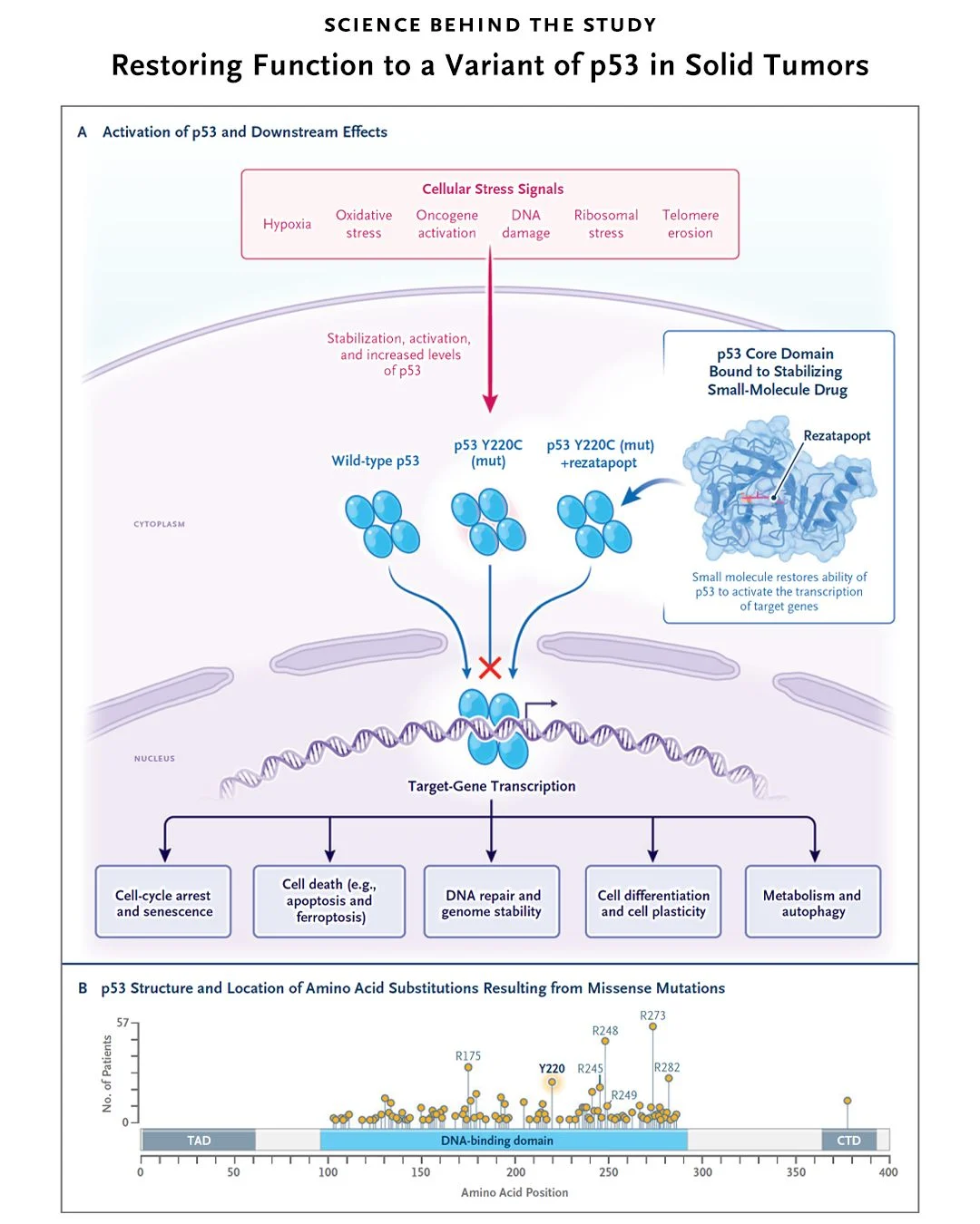 In NEJM, Dumbrava et al. report the results of a phase 1 trial of rezatapopt, a reactivator of the p53 protein, in patients with solid tumors harboring a specific TP53 mutation. They observed an overall response of 20% among participants whose tumors were measured at the start of the trial, which represents a proof of concept for tumor-suppressor reactivation.