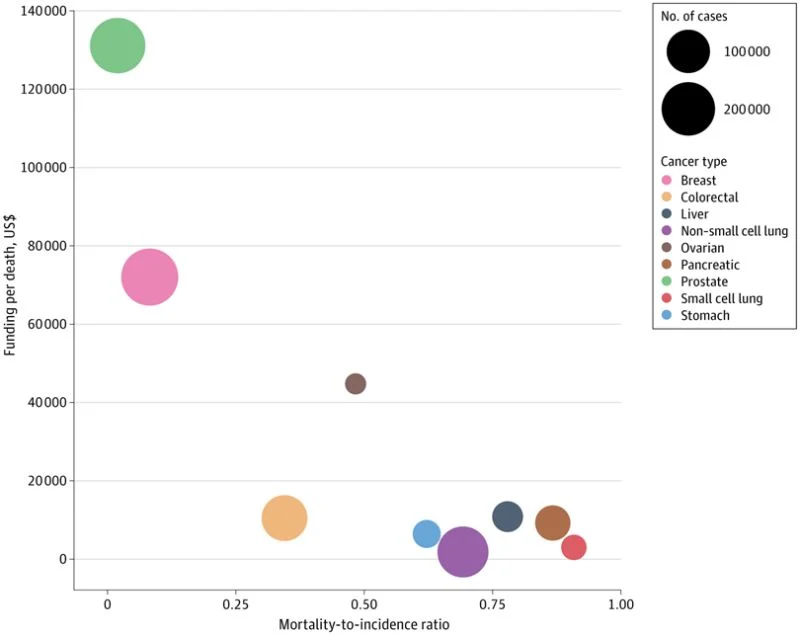 “US NIH cancer research funding per death is substantially higher for less-lethal cancers such as Breast Cancer and Prostate Cancer vs highly lethal cancers such as Small Cell Lung Cancer and Pancreatic Cancer.”