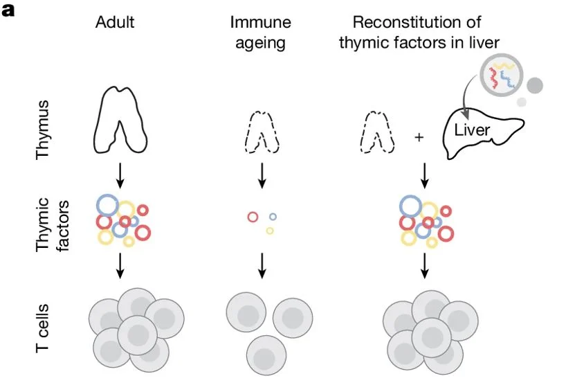 Here, the authors describe an approach for reconstituting thymus-derived factors in the liver to address age-related immune decline.