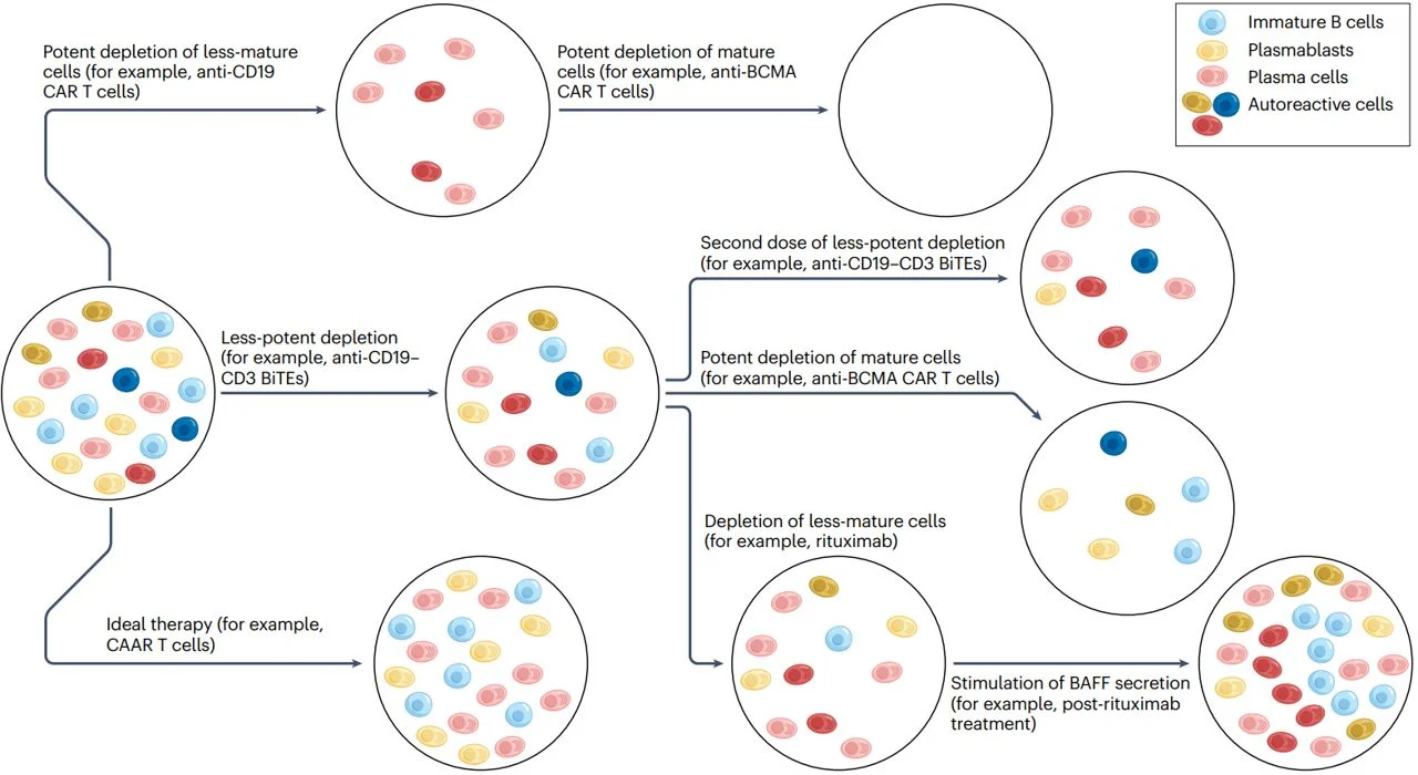 - A current limitation of the field is the inability to identify and specifically eradicate disease-causing B cell clones. Conceptually, the equivalent of oncological ‘minimal residual disease’ is the goal, but with a focus on autoreactive B lineage cells rather than malignant cells. Without robust biomarkers of autoreactivity, ‘cure’ must remain a clinical concept that is impossible to diagnose with certainty.