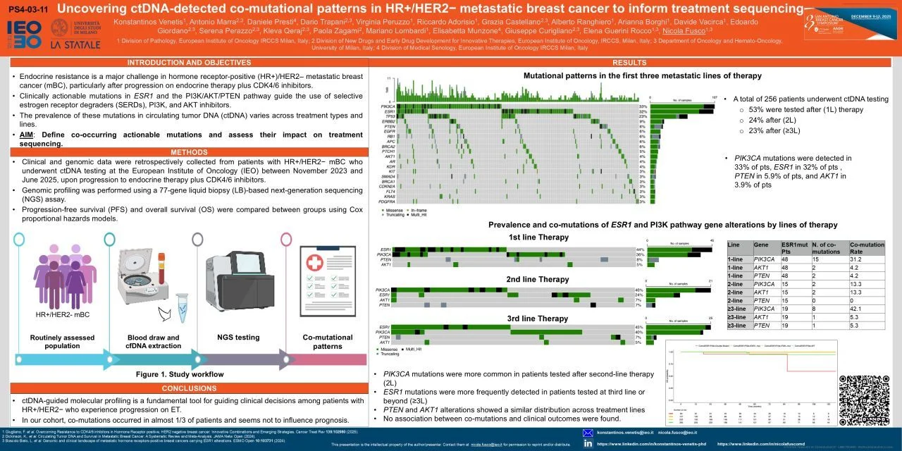 Equally proud of the poster by Konstantinos Venetis and Antonio Marra on ctDNA-detected co-mutational patterns in HR+/HER2− metastatic breast cancer, helping to inform smarter treatment sequencing.