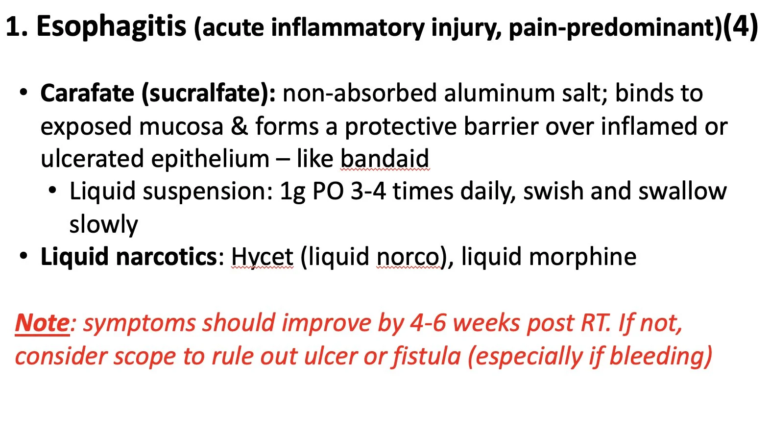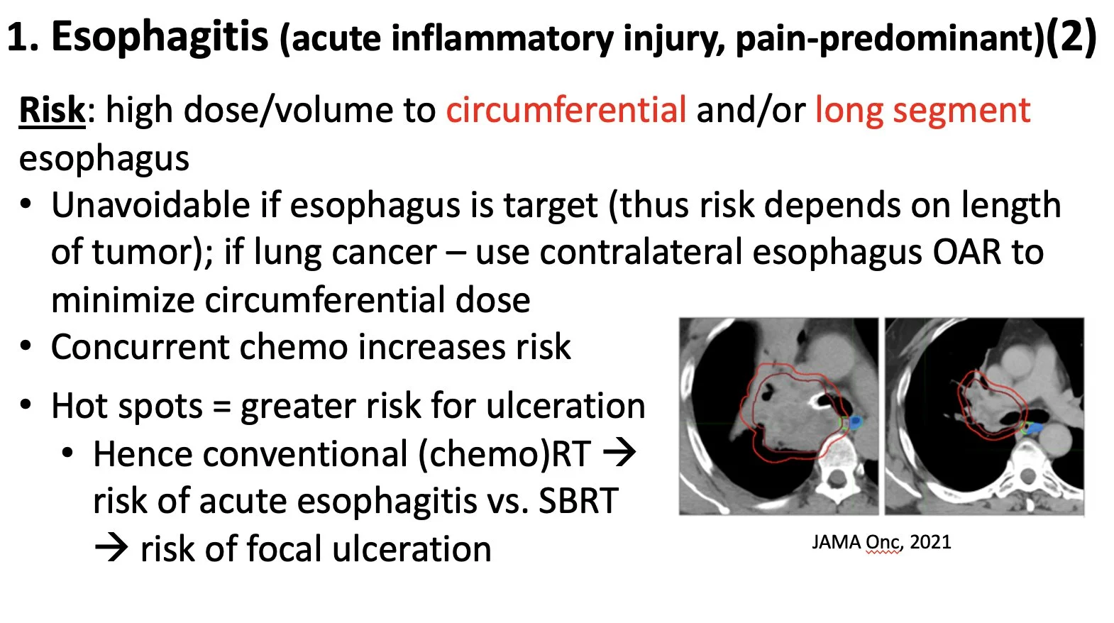 Esophagitis. An acute/sub-acute toxicity caused by direct RT injury to mucosa. High dose/volume to circumferential/long segment esophagus increases risk.