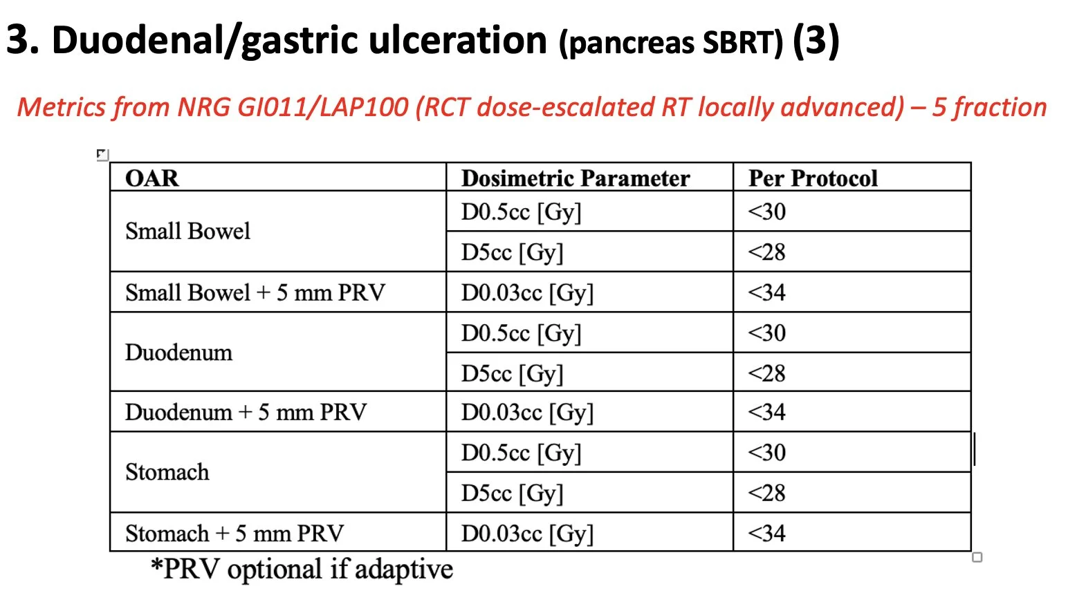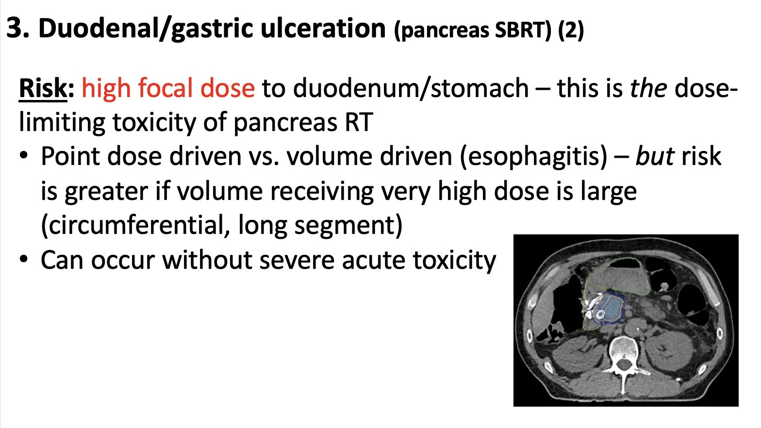 Duodenal/gastric ulceration. This is the dose-limiting toxicity of pancreas SBRT. Uncommon, delayed, but serious & largely preventable. Importantly can happen even if no acute symptoms. Here is my empiric med reg (PPI & carafate). Also metrics from NRG-GI011 (5 fx).