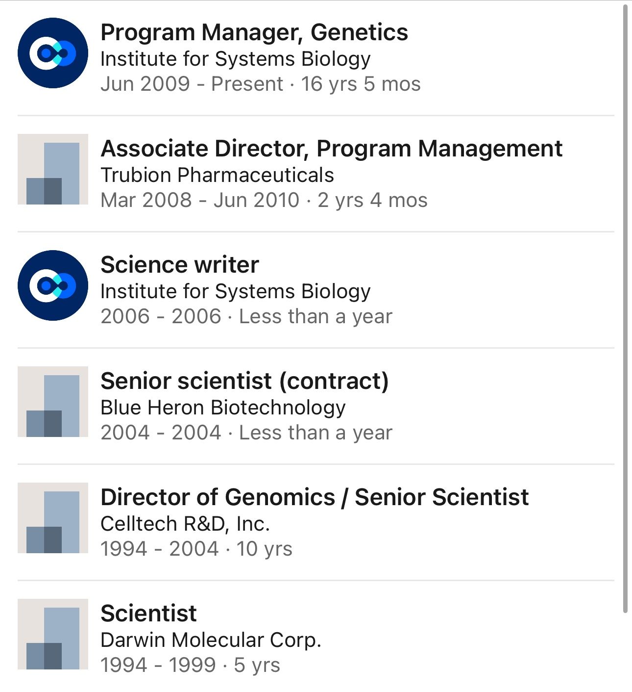 Her bio says: “Since joining ISB in 2009, I have worked to support a number of different projects: Family Genomics in a wide variety of disease areas, the systems biology of Lyme disease, sepsis biomarkers, and scientific wellness.”
