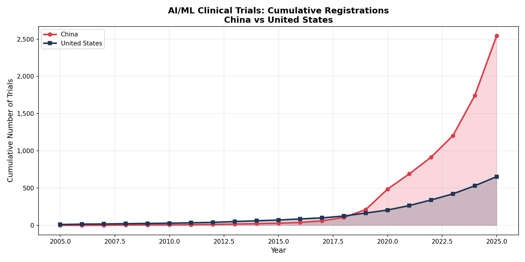 I analyzed WHO clinical trial registry data, searching for “artificial intelligence” OR “machine learning” OR “AI” and comparing trials in China vs the United States. The trajectories are starkly different.