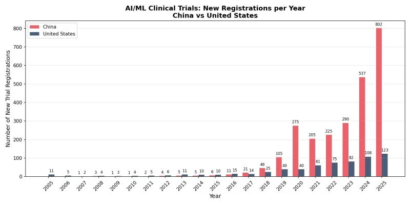 In 2016, the US was still ahead. By 2019, China had overtaken the US cumulatively. In 2025, China registered 802 new AI clinical trials. The US registered 123.
