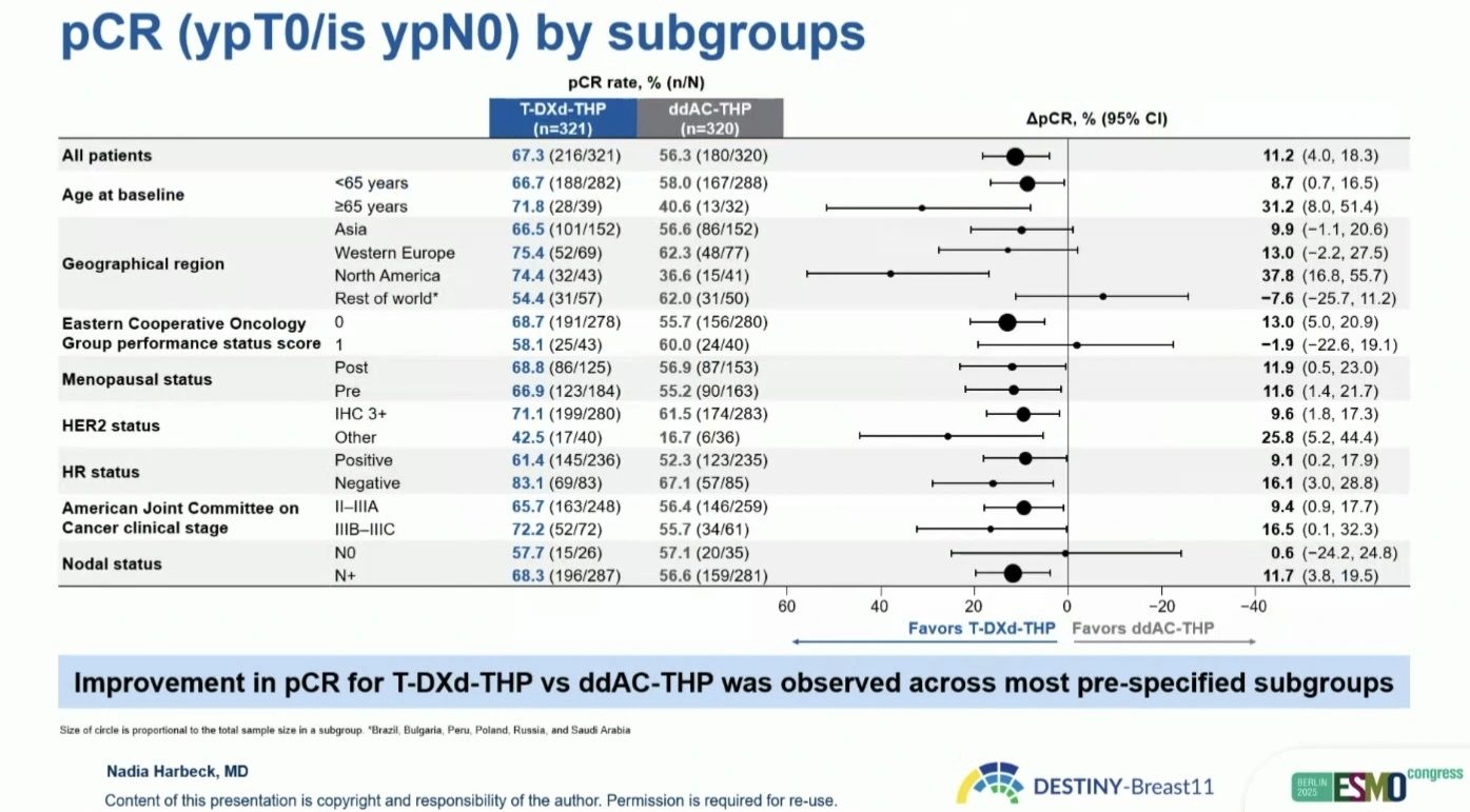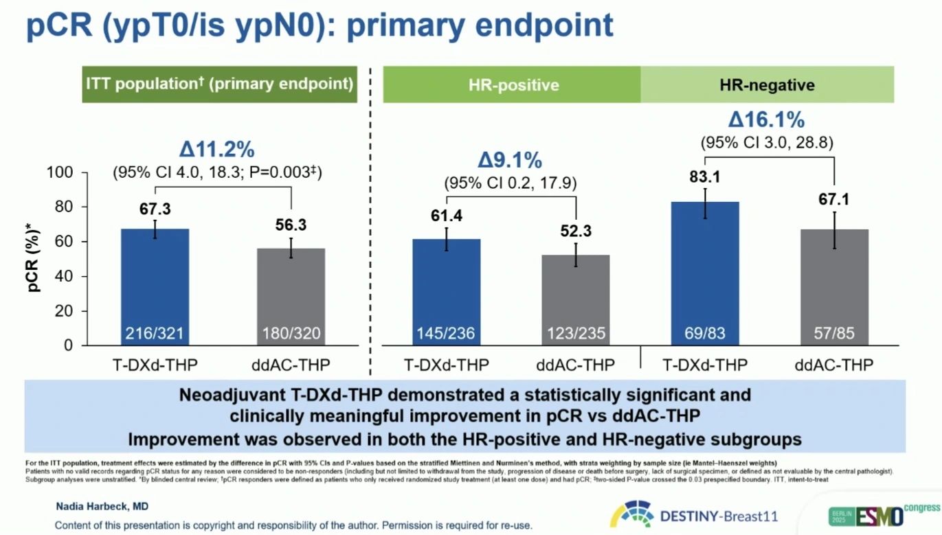 - pCR: 67.3% (T-DXd–THP) vs 56.3% (ddAC–THP) → Absolute benefit: +11.2% (95% CI 4.0–18.3; p = 0.003)