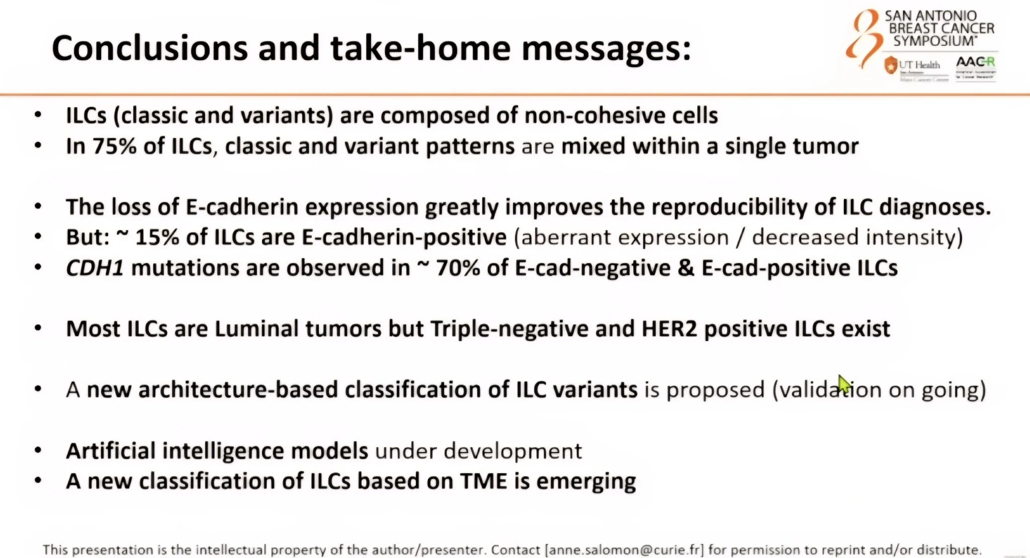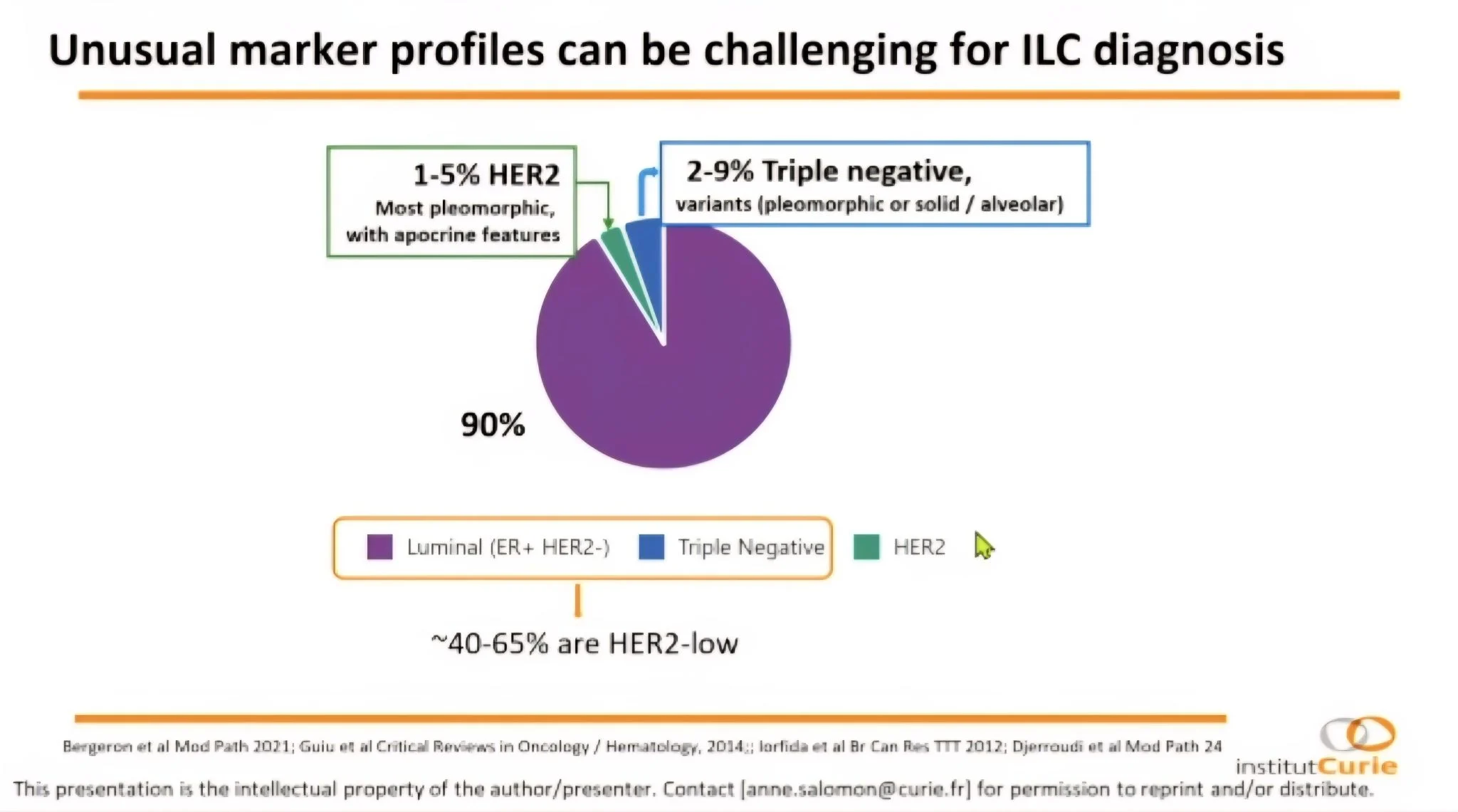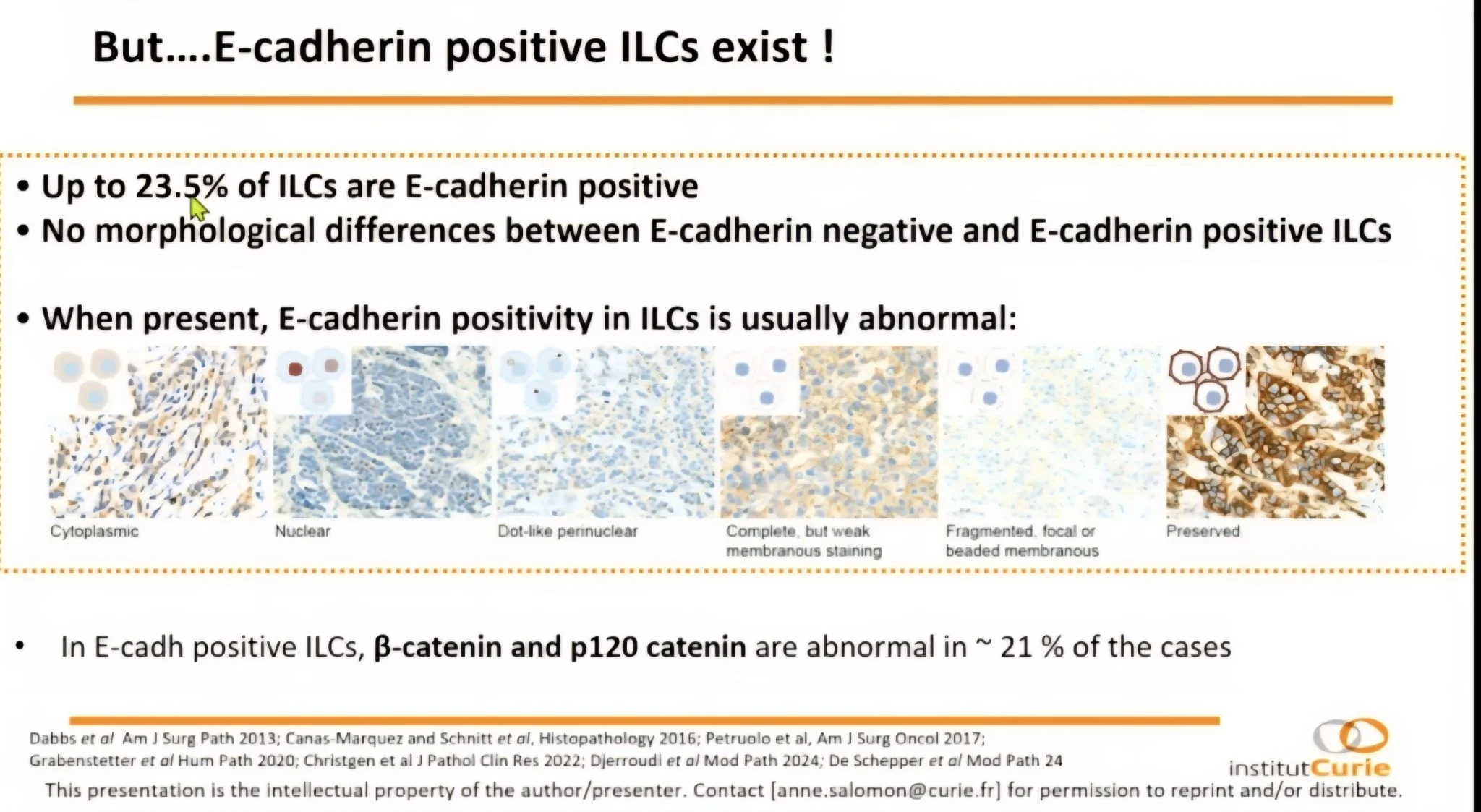 Anne Vincent-Salomon highlighted the ongoing challenges with diagnostic criteria and classification. We often rely on loss of E-cadherin to identify ILC, yet this is present in only about 85% of cases. Around 23.5% may still be E-cadherin positive. Many tumours also show mixed patterns rather than the classical form. While most ILCs are luminal, a small proportion are HER2 positive (1 to 5%) or triple negative (2 to 9%).