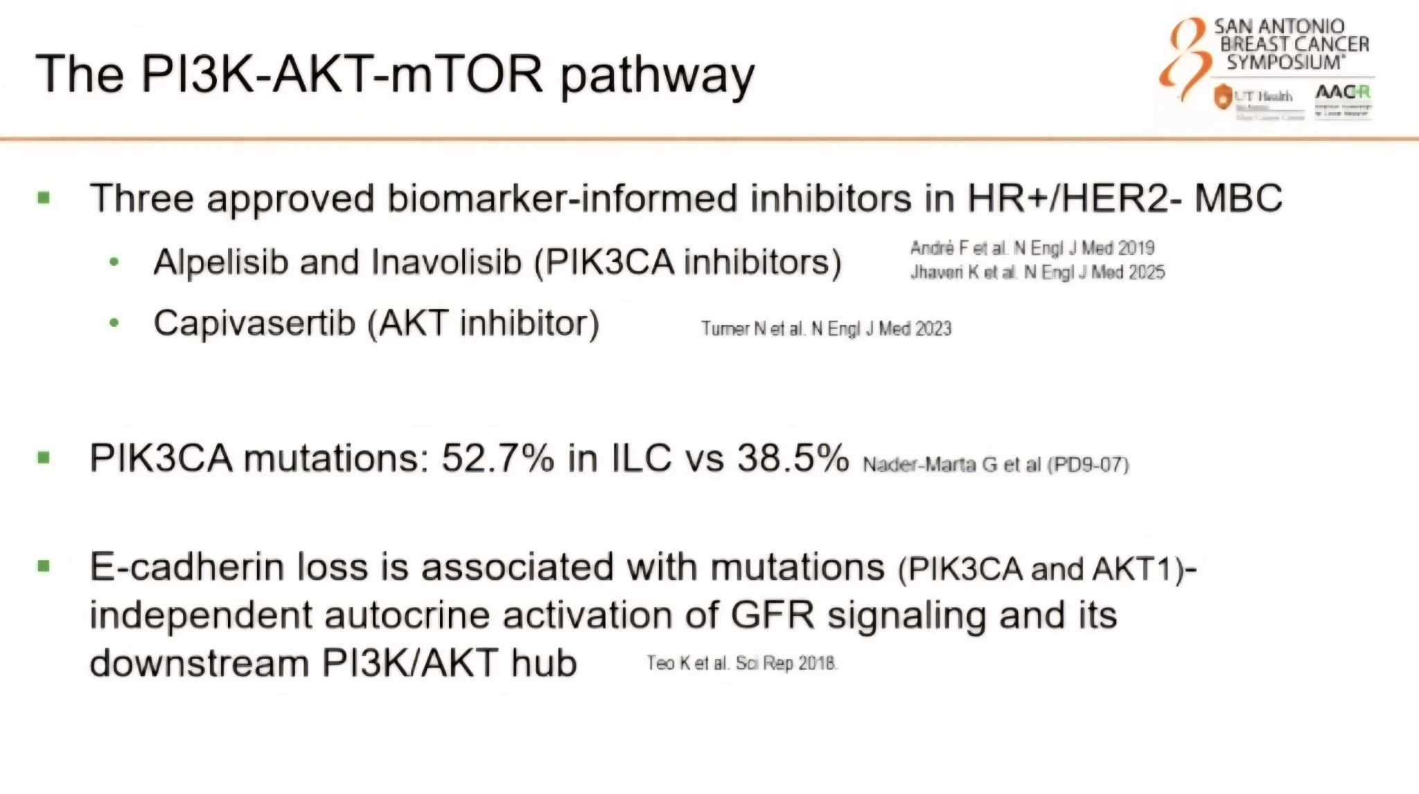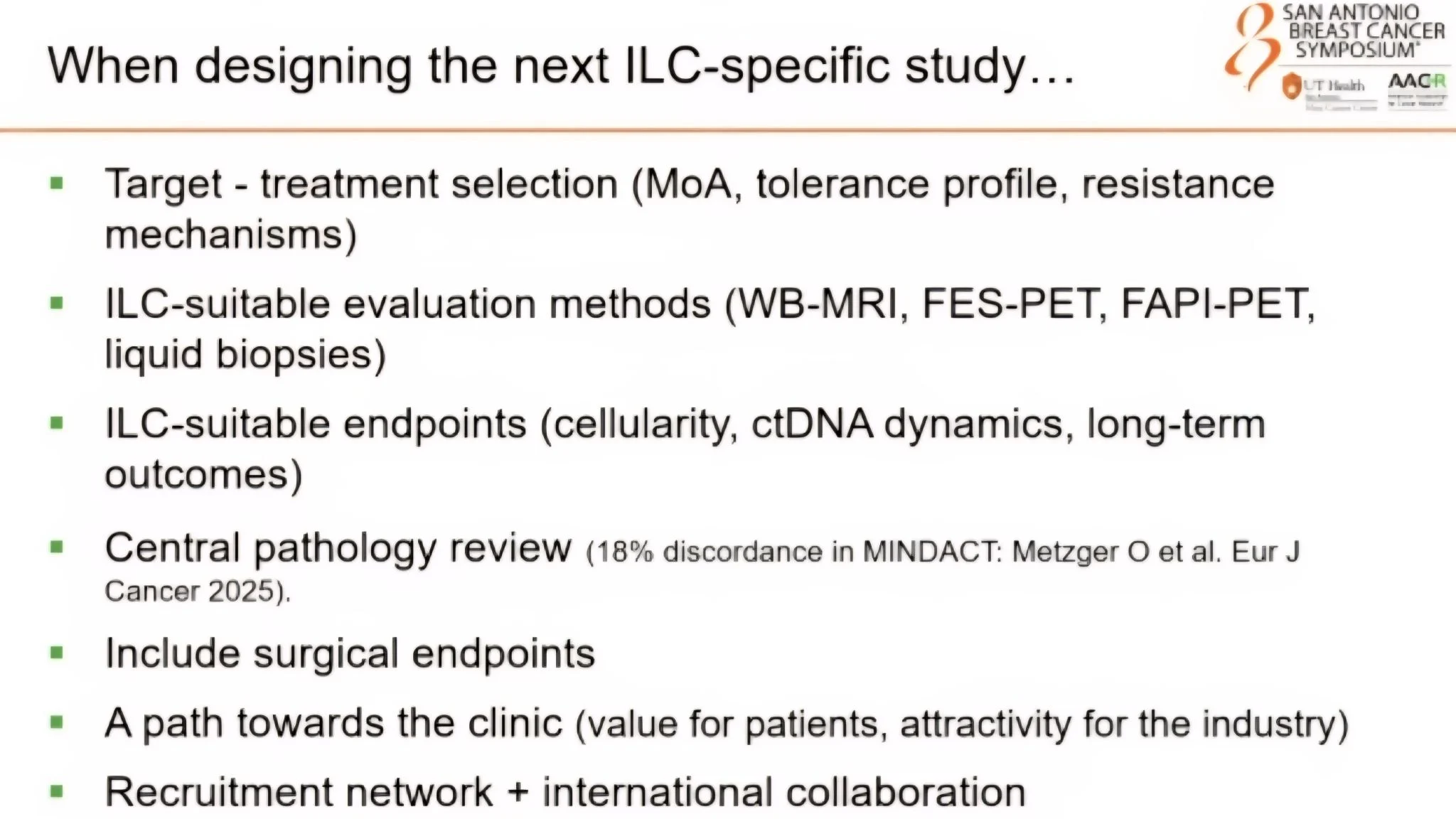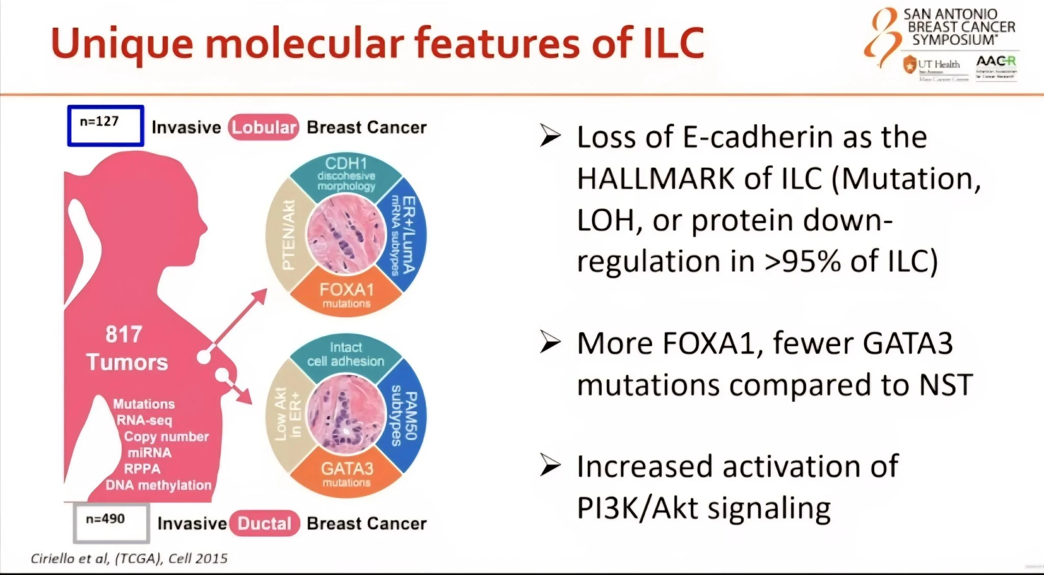 Philippe Aftimos MD noted that loss of E-cadherin is linked with higher rates of PIK3CA and AKT mutations. This is valuable information as we design future ILC-specific trials. He also emphasised the need for better evaluation methods for ILC, such as whole-body MRI for RECIST, central pathology review and more suitable endpoints like ctDNA dynamics and long-term outcomes, given the dormancy often seen in ILC.
