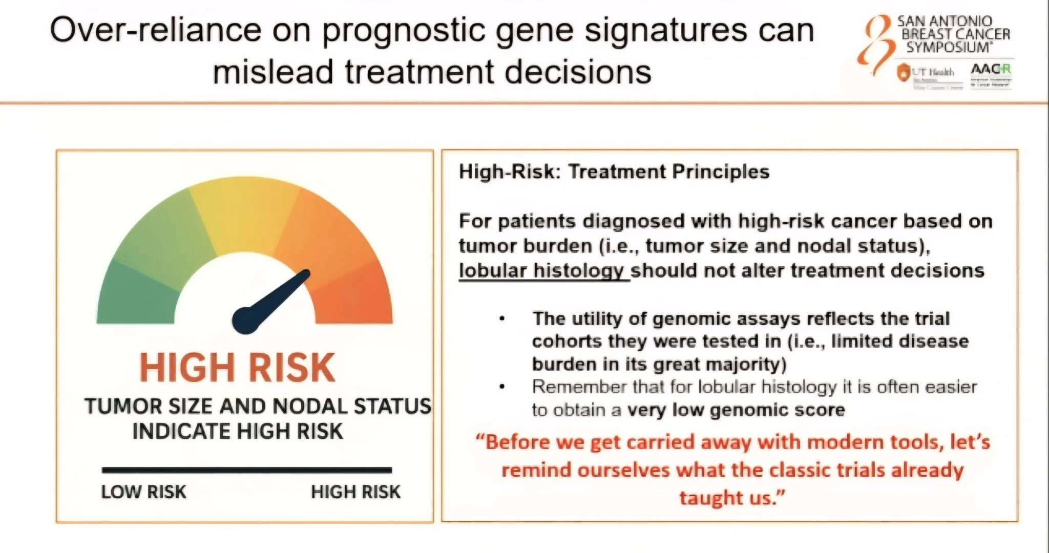 Otto Metzger urged caution when interpreting genomic risk scores in ILC. These tumours are often low grade with low mitotic activity, which can lead to deceptively low recurrence scores. As seen in RxPonder, this creates discordance. The long-held belief that ILC does not benefit from adjuvant chemotherapy needs a closer look. Lobular histology alone should not be used as a reason to omit chemotherapy. The choice of endocrine therapy is also important, as ILC can show resistance to Tamoxifen.
