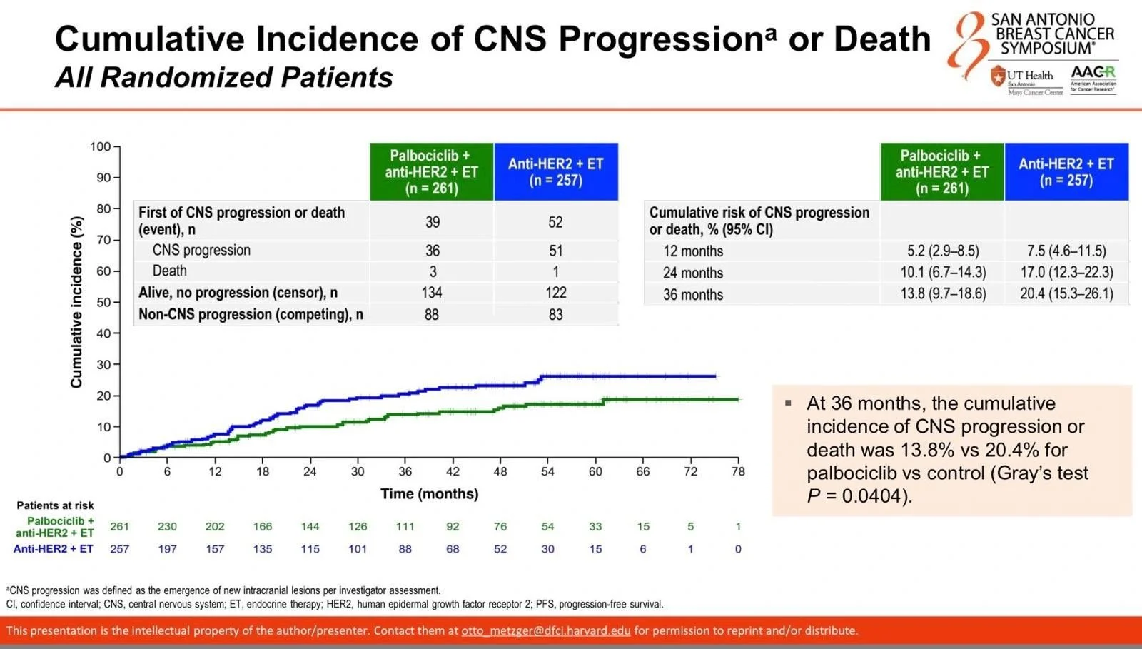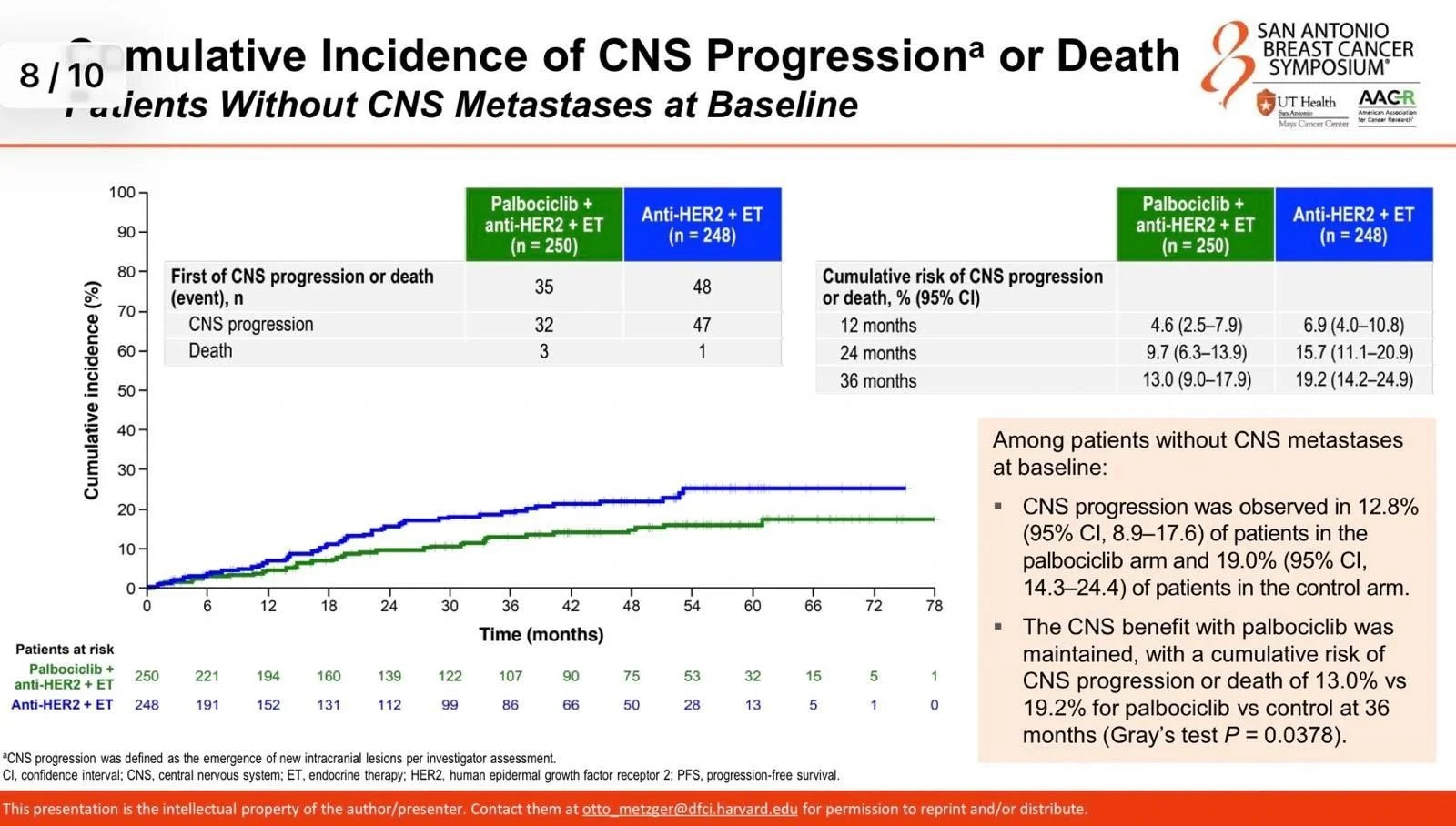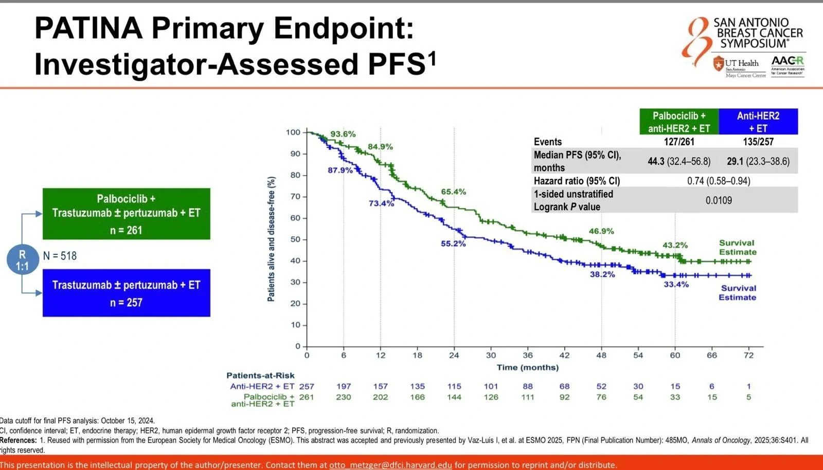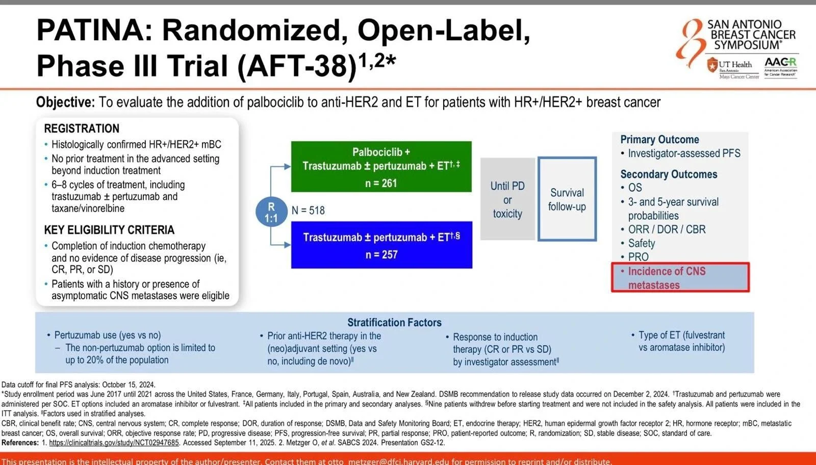 At 10-year follow-up: improved DFS and time to distant recurrence with AI (HR 0.65), seen in both premenopausal patients receiving OFS plus AI and in postmenopausal patients. There was no OS difference. Importantly, there was no benefit from adding OFS to tamoxifen. The message is clear: AI plus OFS is preferred. If not feasible, tamoxifen alone is reasonable. The middle ground of tamoxifen plus OFS adds no benefit. - PATINA and CNS outcomes