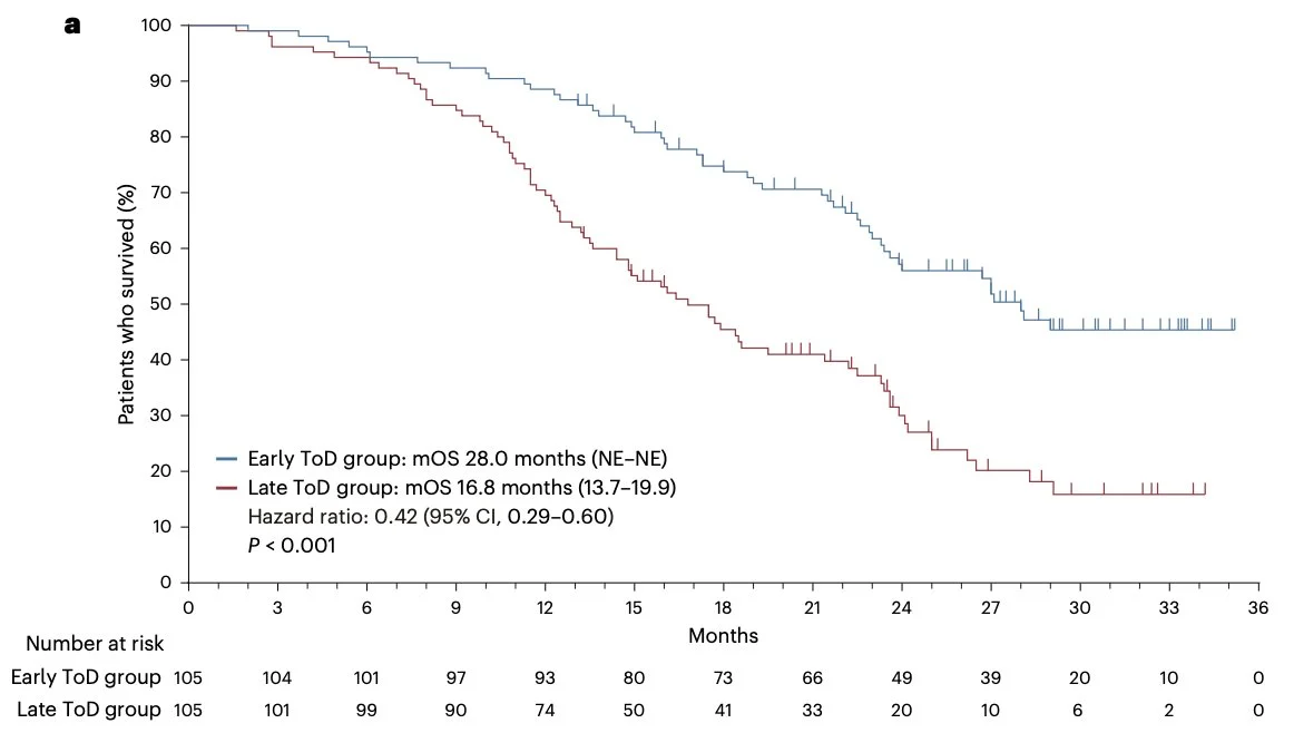 In a prospective, randomized phase III trial, giving first-line chemo-immunotherapy earlier in the day (<15:00) nearly doubled PFS (11.3 vs 5.7 mo, HR 0.40) and improved OS (28.0 vs 16.8 mo; HR 0.42) in advanced NSCLC.