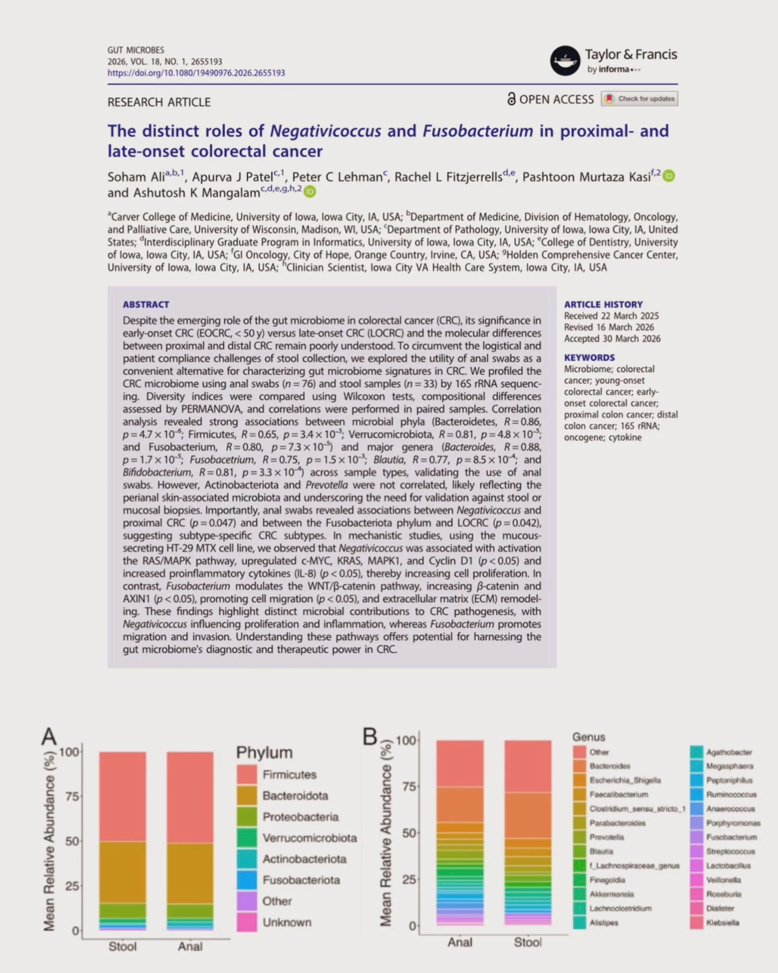 With Colorectal Cancer rising, this comprehensive body of work examines many aspects of the gut microbiome. Anal Swab as a composite for stool samples Early- late-onset Proximal distal.”