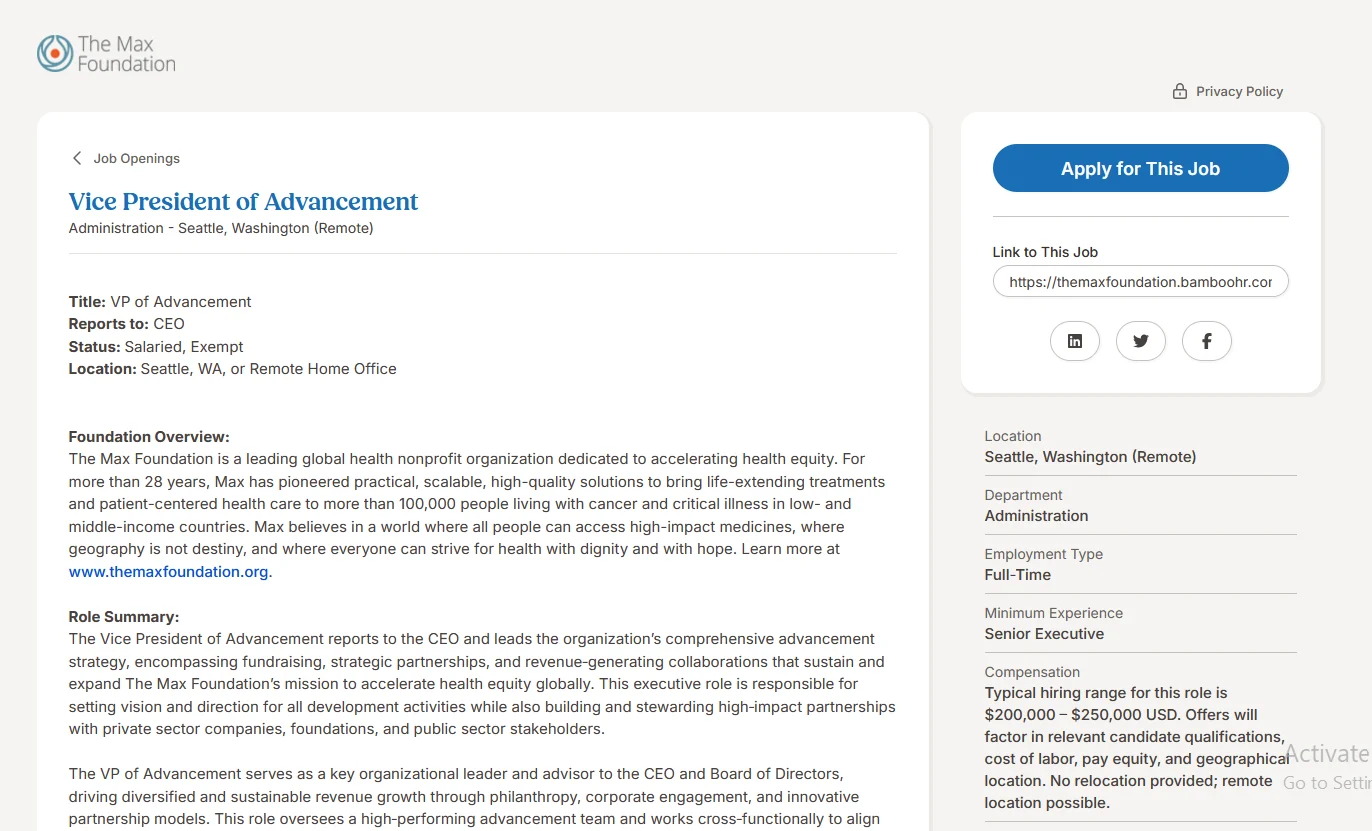 “We’re hiring! The Max Foundation is seeking a US-based Vice President of Advancement who will be responsible for leading the organization’s comprehensive advancement strategy, including fundraising, strategic partnerships, and revenue-generating collaborations that sustain and expand our mission to accelerate health equity globally.