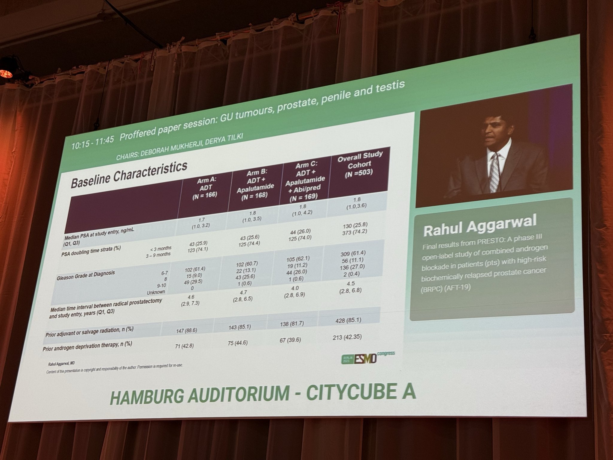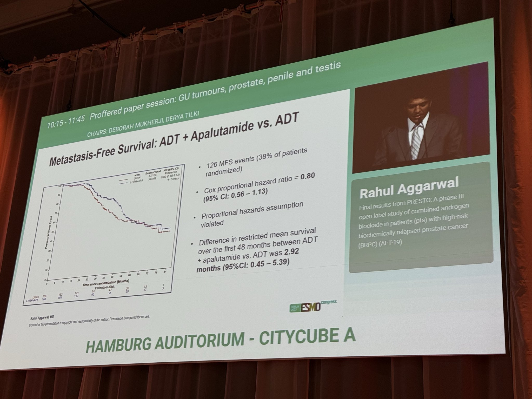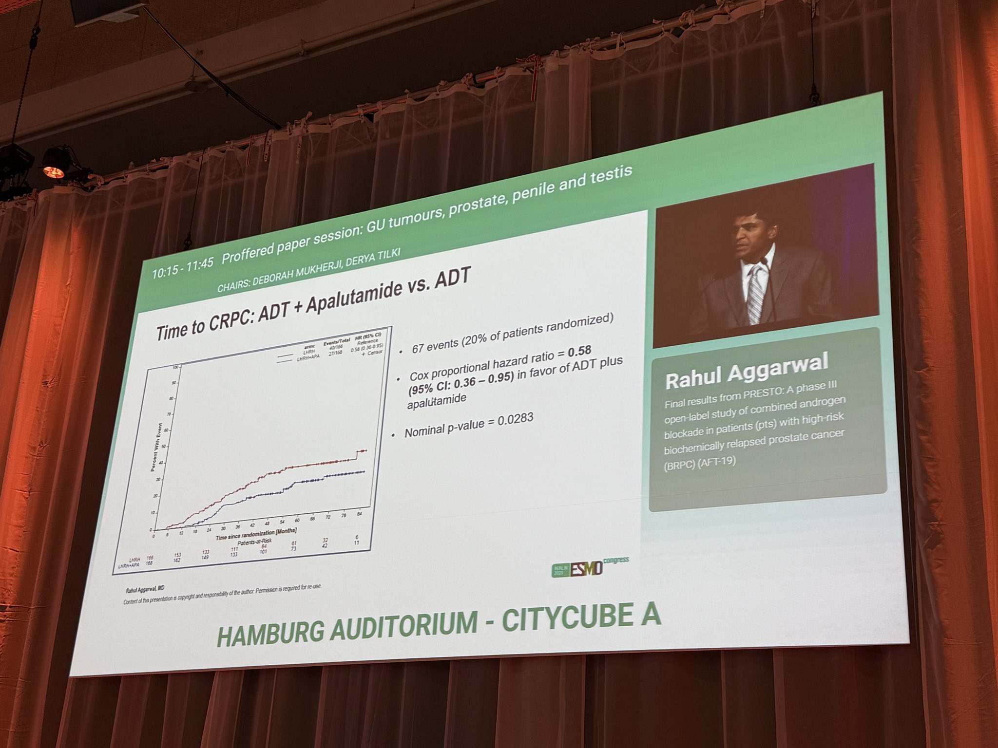“Rahul Aggarwal showing MFS & time to castration resistance benefit of ADT and apalutamide in the ALLIANCE PRESTO trial — important work for PSA recurrent disease.”
