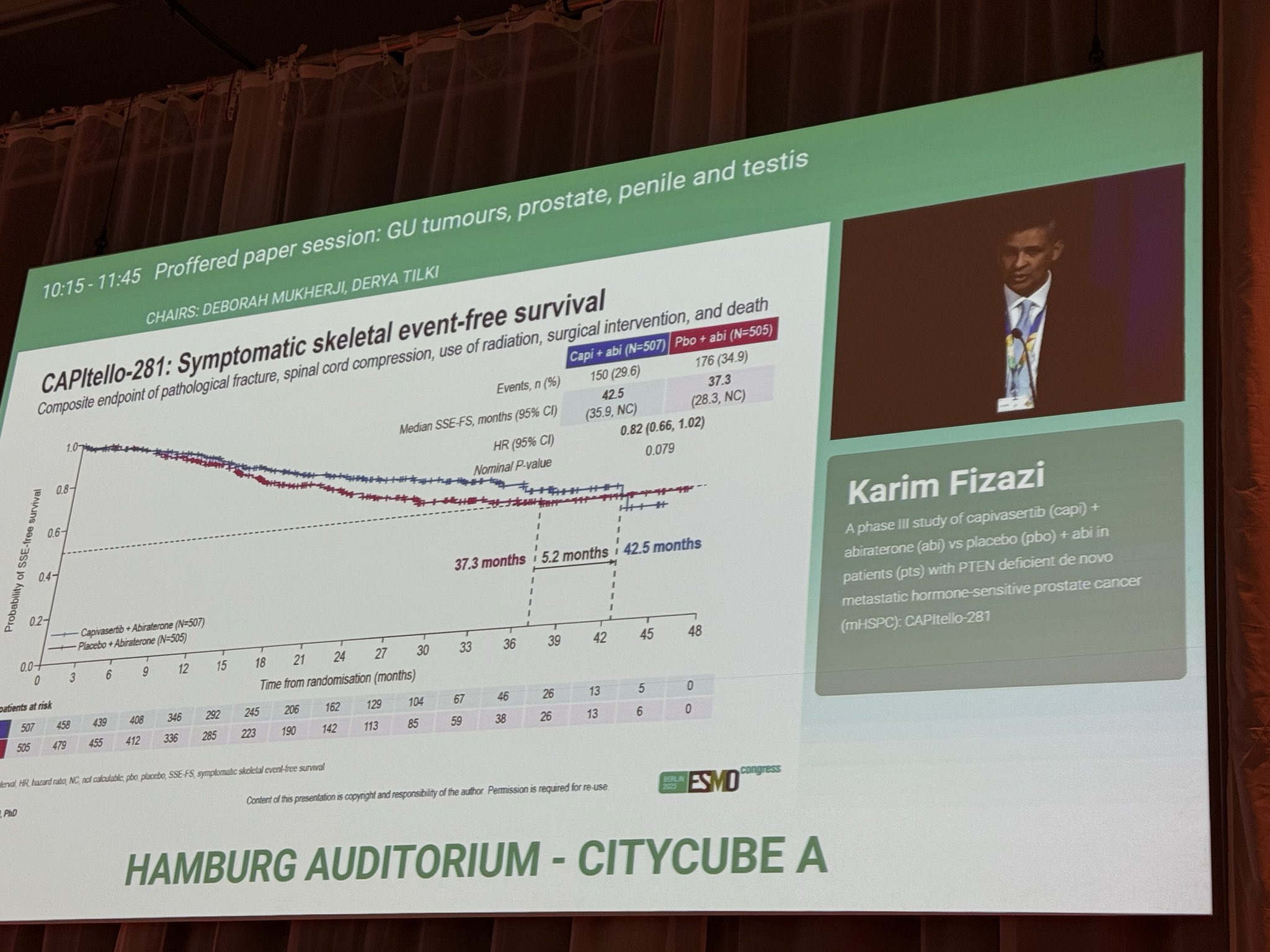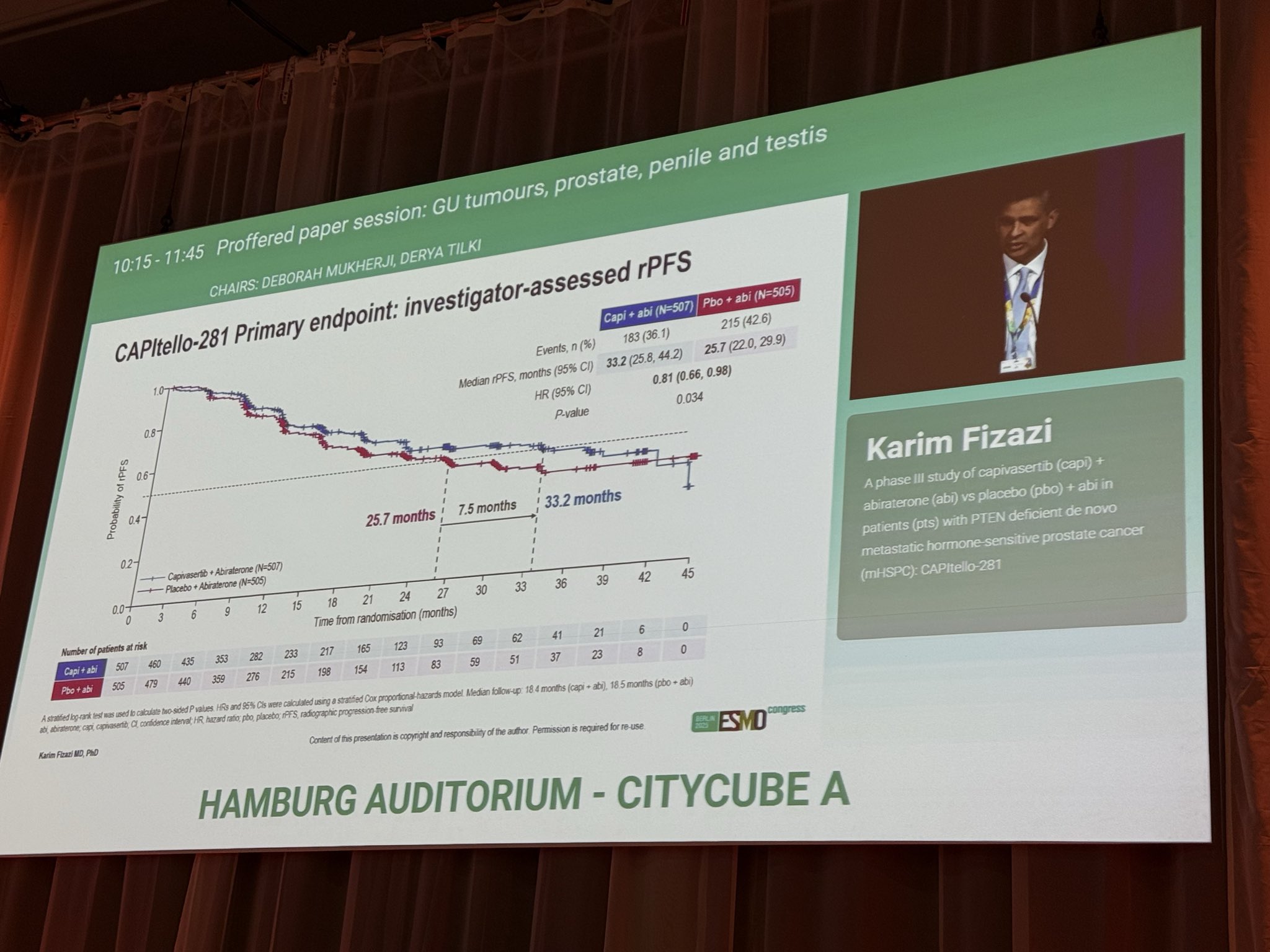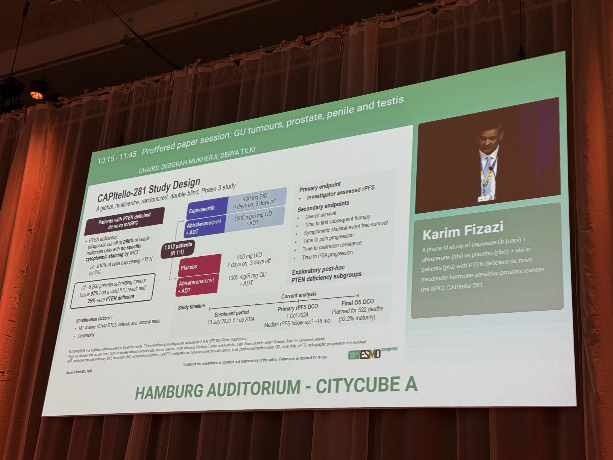 “Karim Fizazi with primary analysis of CAPITELLO 281, capivasertib with ADT in metastatic hormone sensitive prostate cancer improved rPFS for PTEN deficient disease. >6000 patients screened (!!) Concurrent pub Annals Oncology.”
