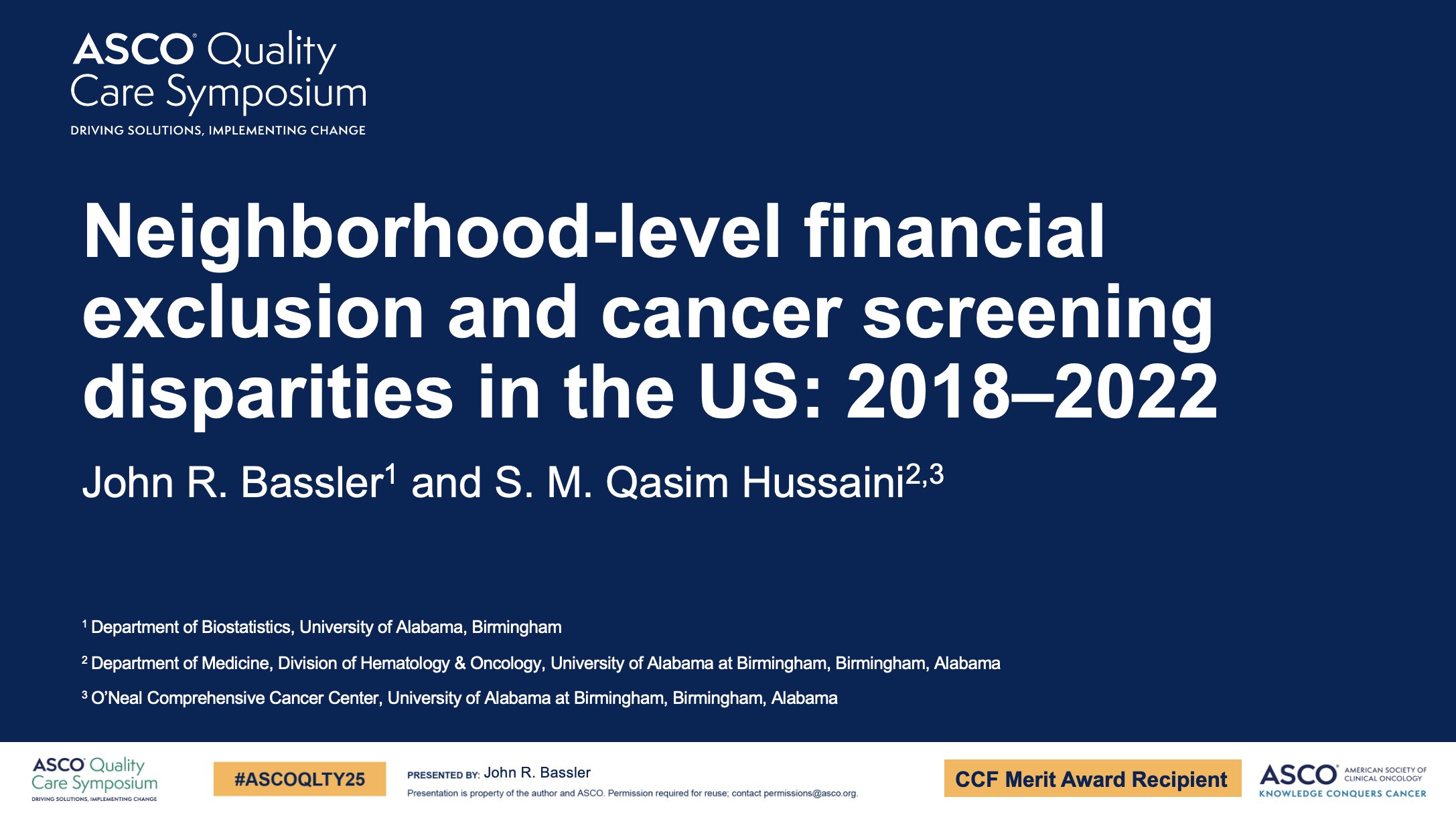 Big congratulations to DrPH candidate John Bassler for presenting our work at ASCOQLTY25 and receiving a Merit Award! Reminder that housing policy is health policy.”