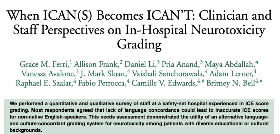 “Shots fired in CLML! Extremely insightful survey into issues with diagnosing ICANS if limited English proficiency. A CAR-T/bsAb problem we don’t talk enough about as a field. Great work by Grace Ferri, J Mark Sloan, Vaishali Sanchorawala et al – prospective pilot study in development!
